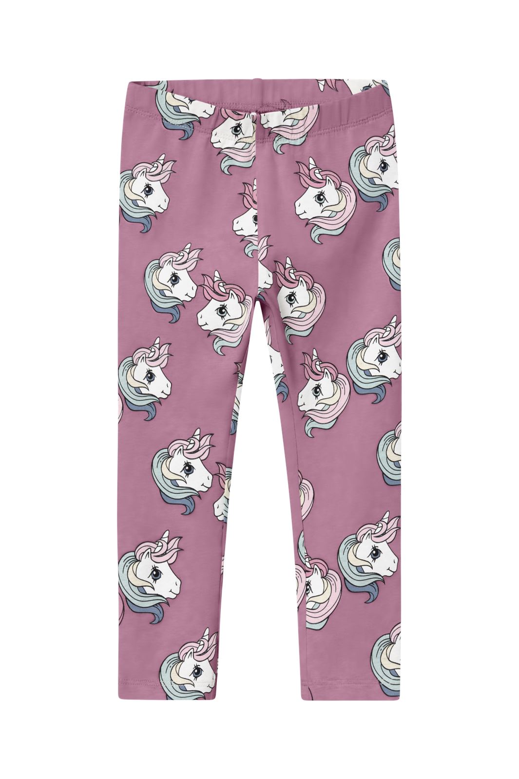 Leggings i lyselilla med enhjørningemønster. Det bløde bomuldsstof har et gentaget print af enhjørningehoveder i pink og blå nuancer på en mauve-orchid-baggrund.