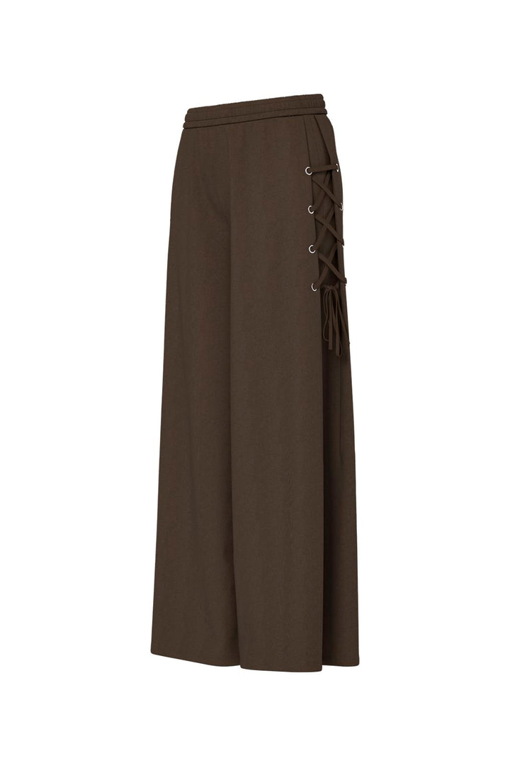 Nederdelen i 100% polyester har en satin-lignende finish, der giver stoffet et flydende fald og en glansfuld overflade. Den sorte blondekant langs den asymmetriske kant er placeret både for og bag, hvilket skaber et dekorativt element der bryder satin-overfladens ensartethed. Den dybe lilla-bordeaux nuance "Potent Purple" har undertoner der gør den nem at kombinere med sort, som fungerer som neutral base i kvinder-kollektionen.