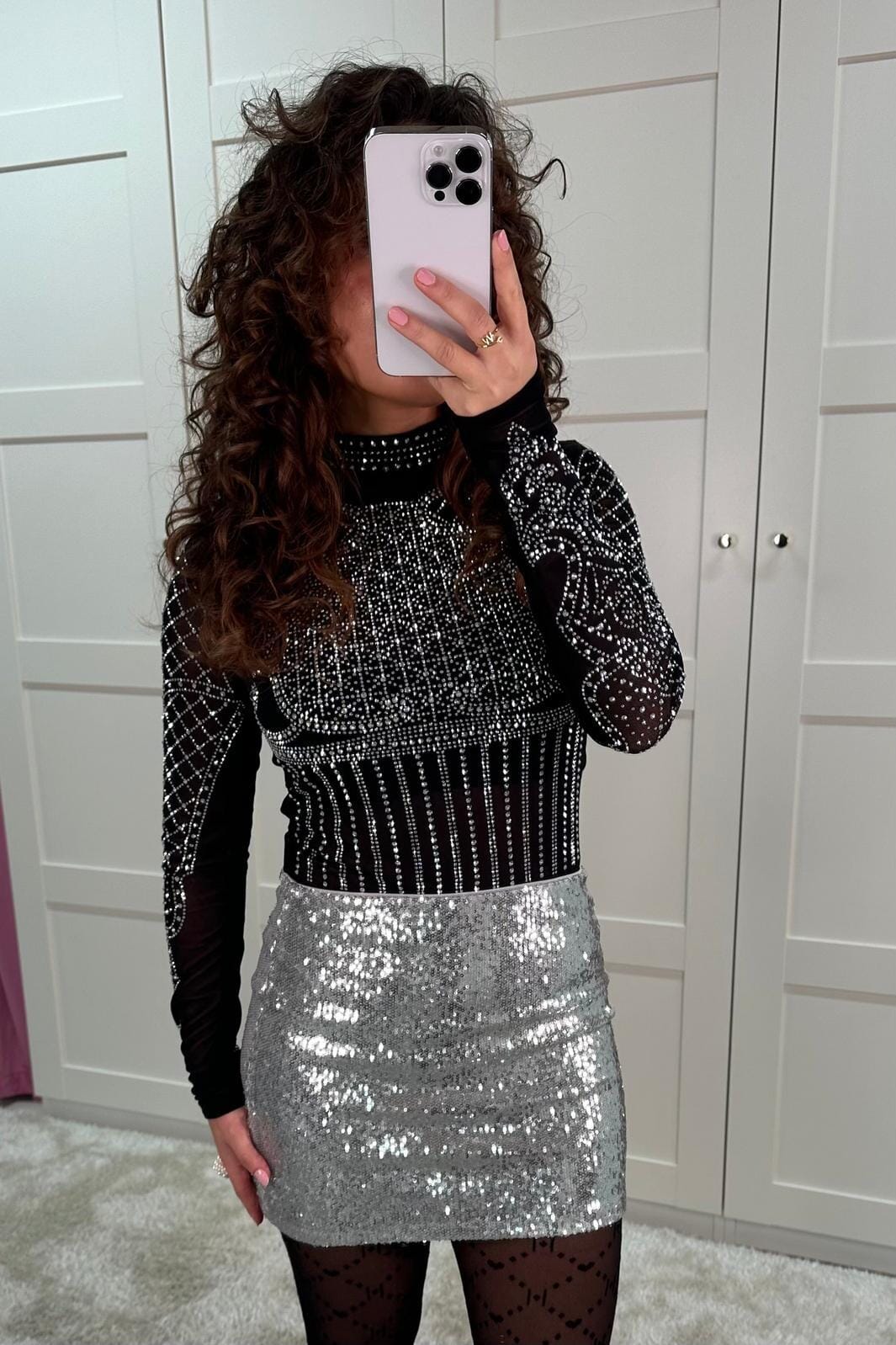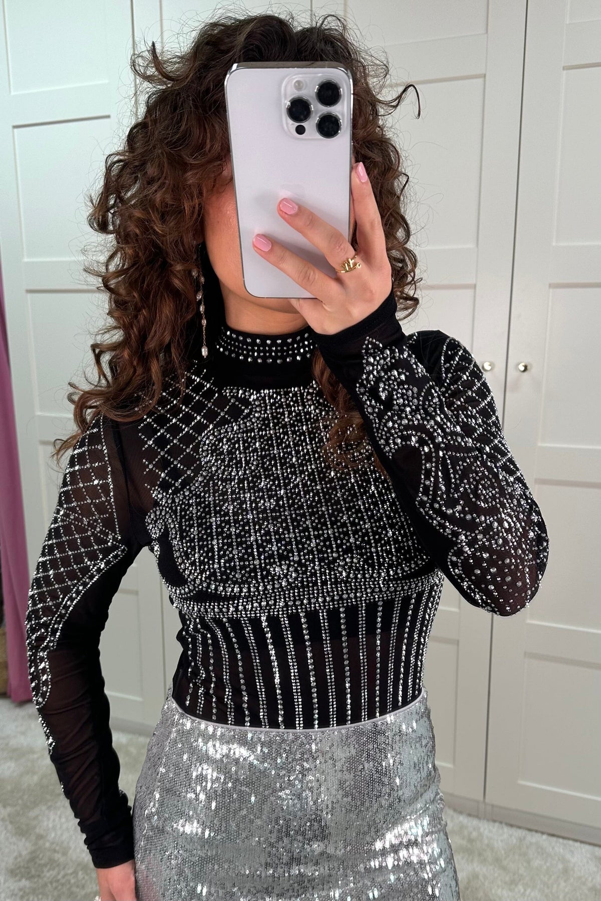 Sort bodysuit fra A-bee med rhinsten-dekoration. Designet til festlige lejligheder, hvor man vil skille sig ud med et iøjnefaldende look.
