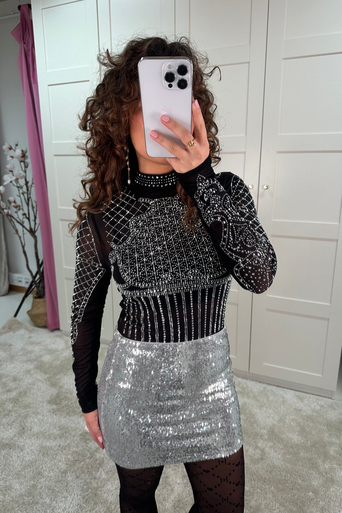 Den høje hals er prydet med rhinsten, hvilket fremhæver halsudskæringen. Dette design giver bodysuitten et raffineret og festligt præg.