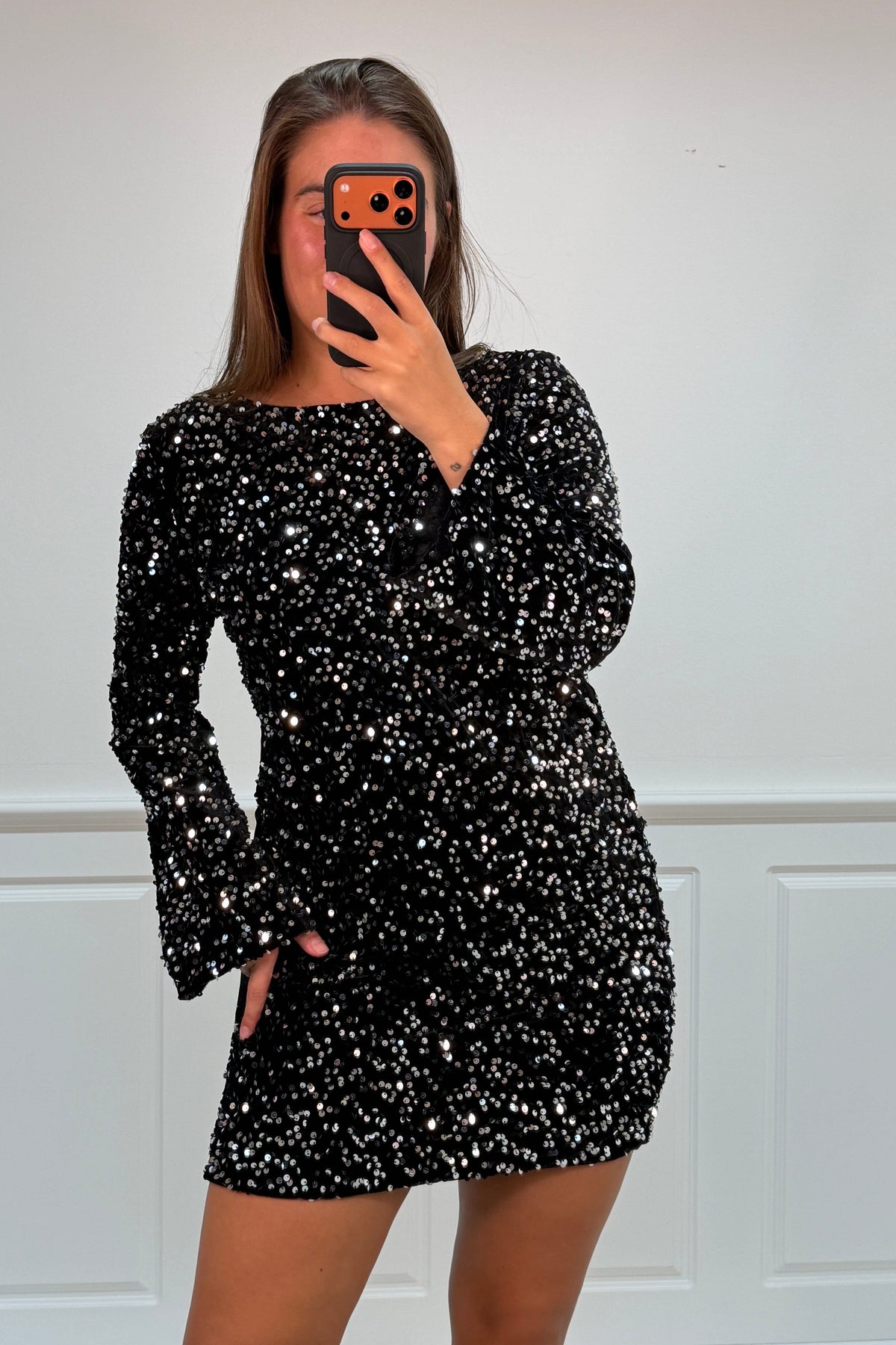 Festkjole fra A-bee med glitrende pailletter og sløjfedetaljer. Kjolen har en sort base med sølvfarvet mønster og lange ærmer. Den runde halsudskæring og sløjfen på ryggen giver kjolen et festligt præg.