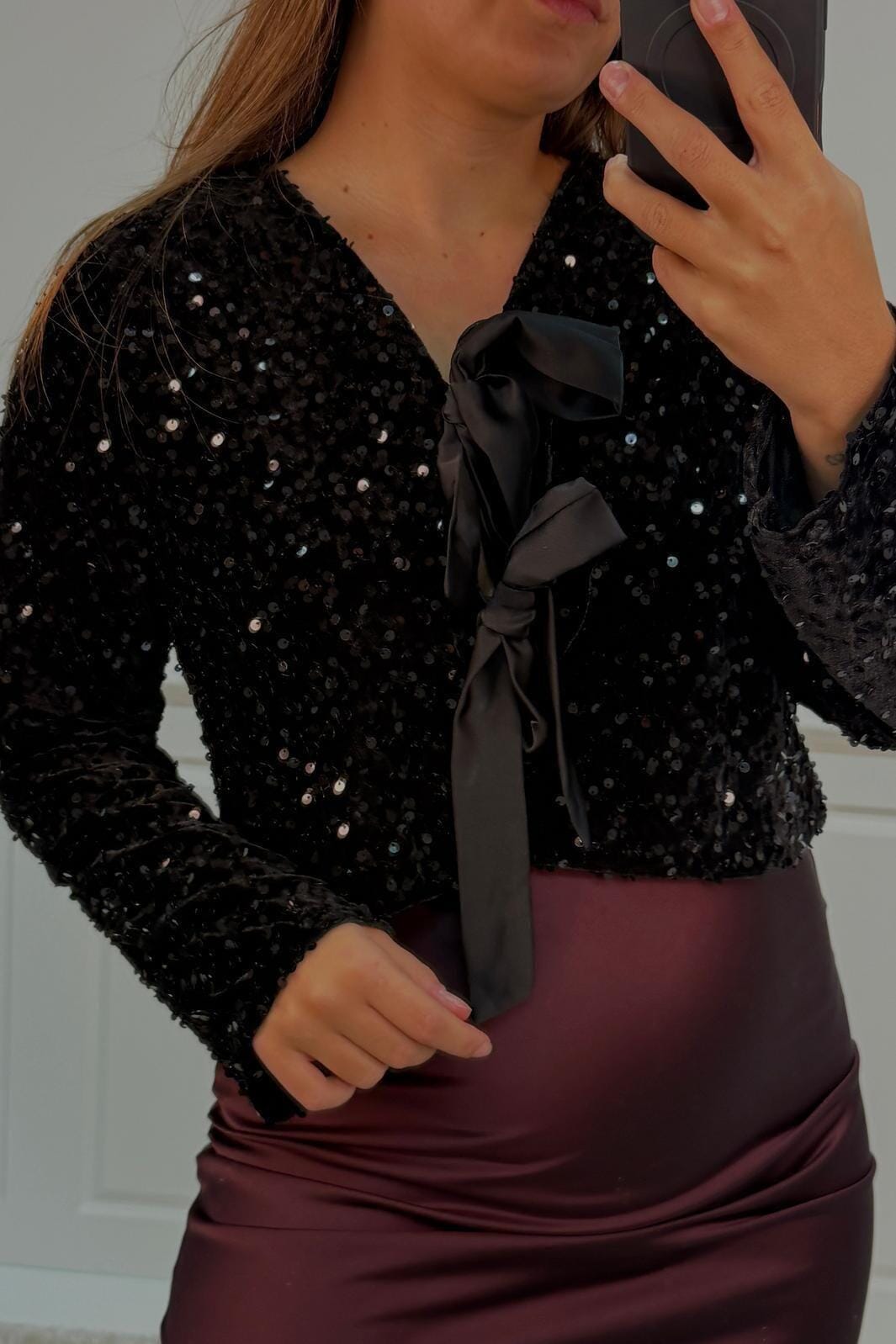 Sort bluse fra A-bee med pailletter og sløjfedetaljer. Blusen har en V-udskæring med snørelukning og lange ærmer. Den glimtende overflade og de dekorative sløjfer gør den velegnet til festlige anledninger.