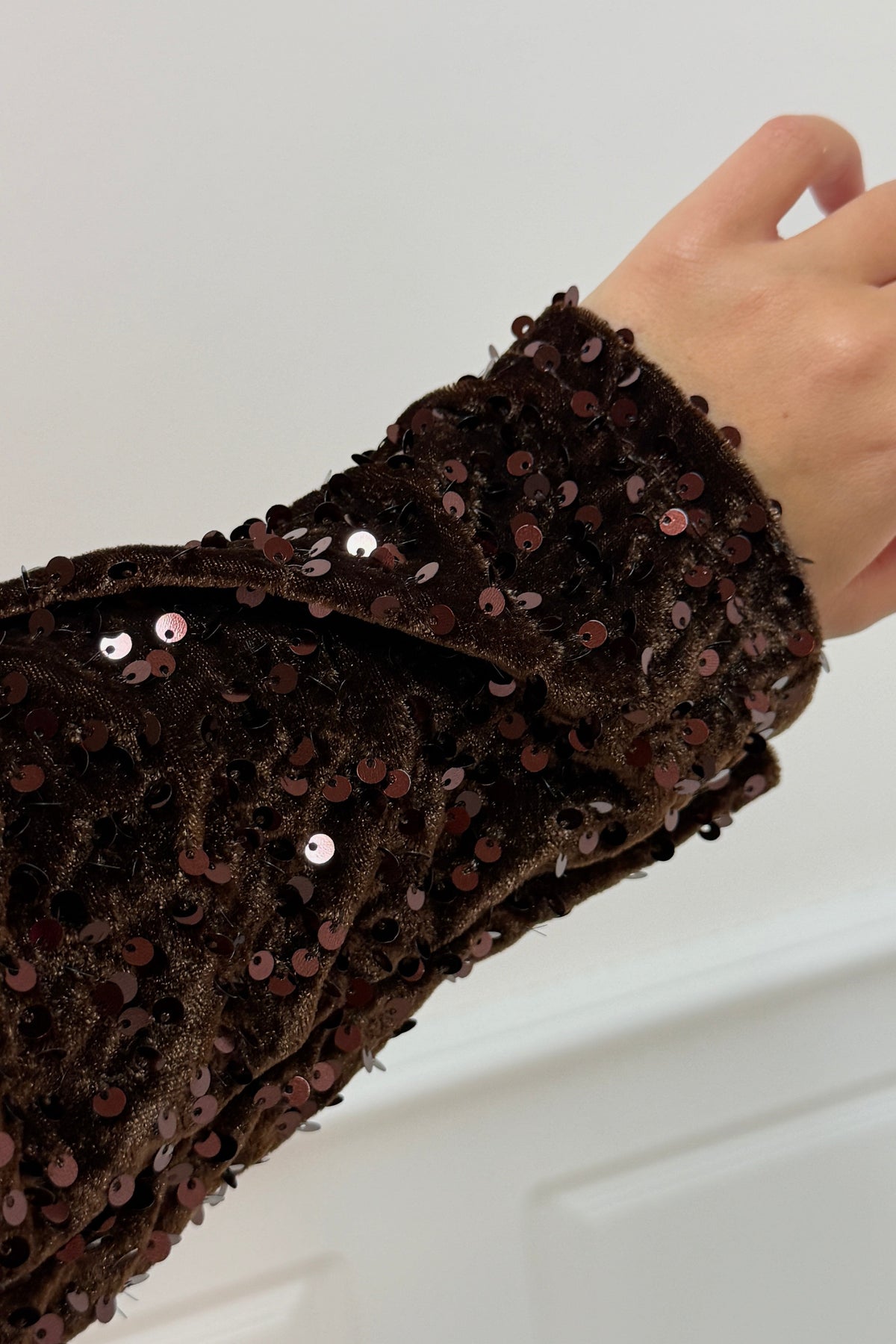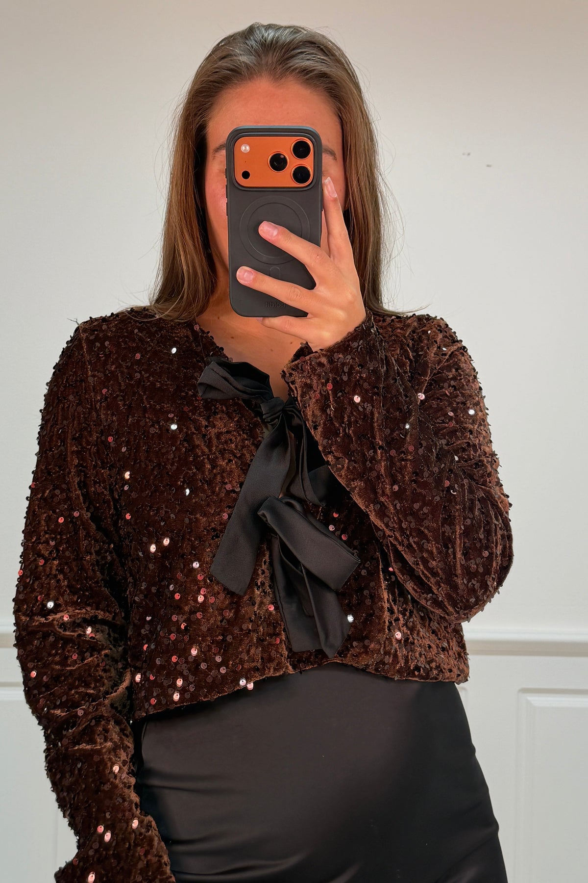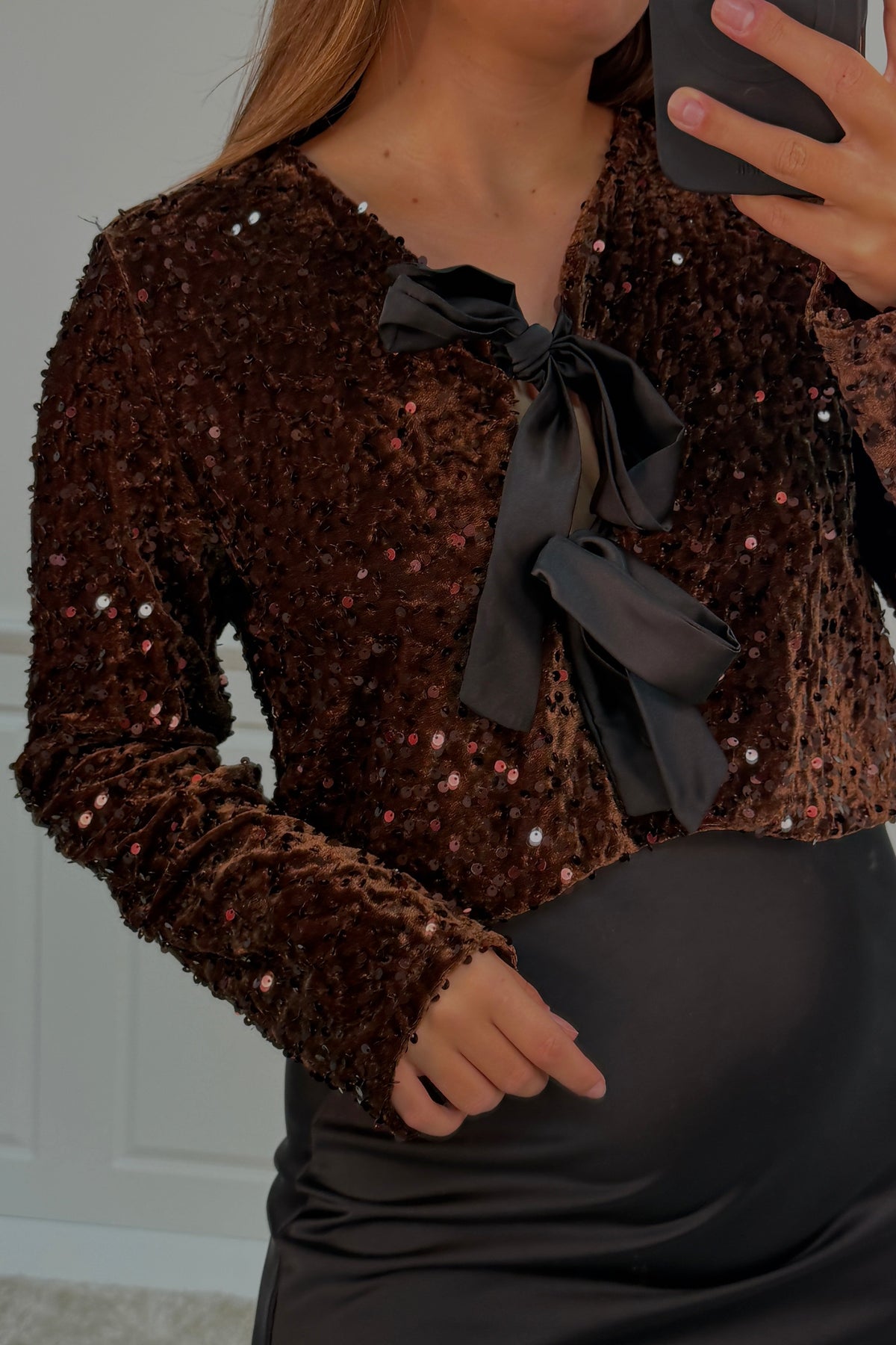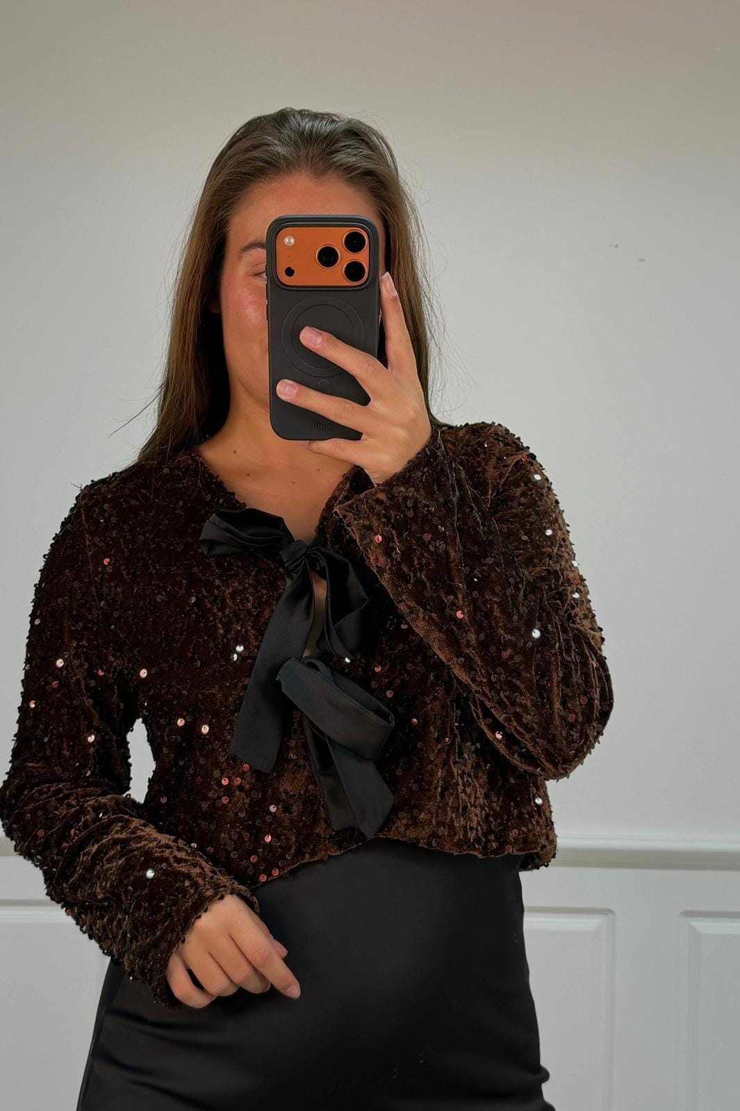 Mørk maroon-bluse fra A-bee med skinnende pailletter over det hele. Den har en sort sløjfe ved V-udskæringen og lange ærmer med en løs pasform.