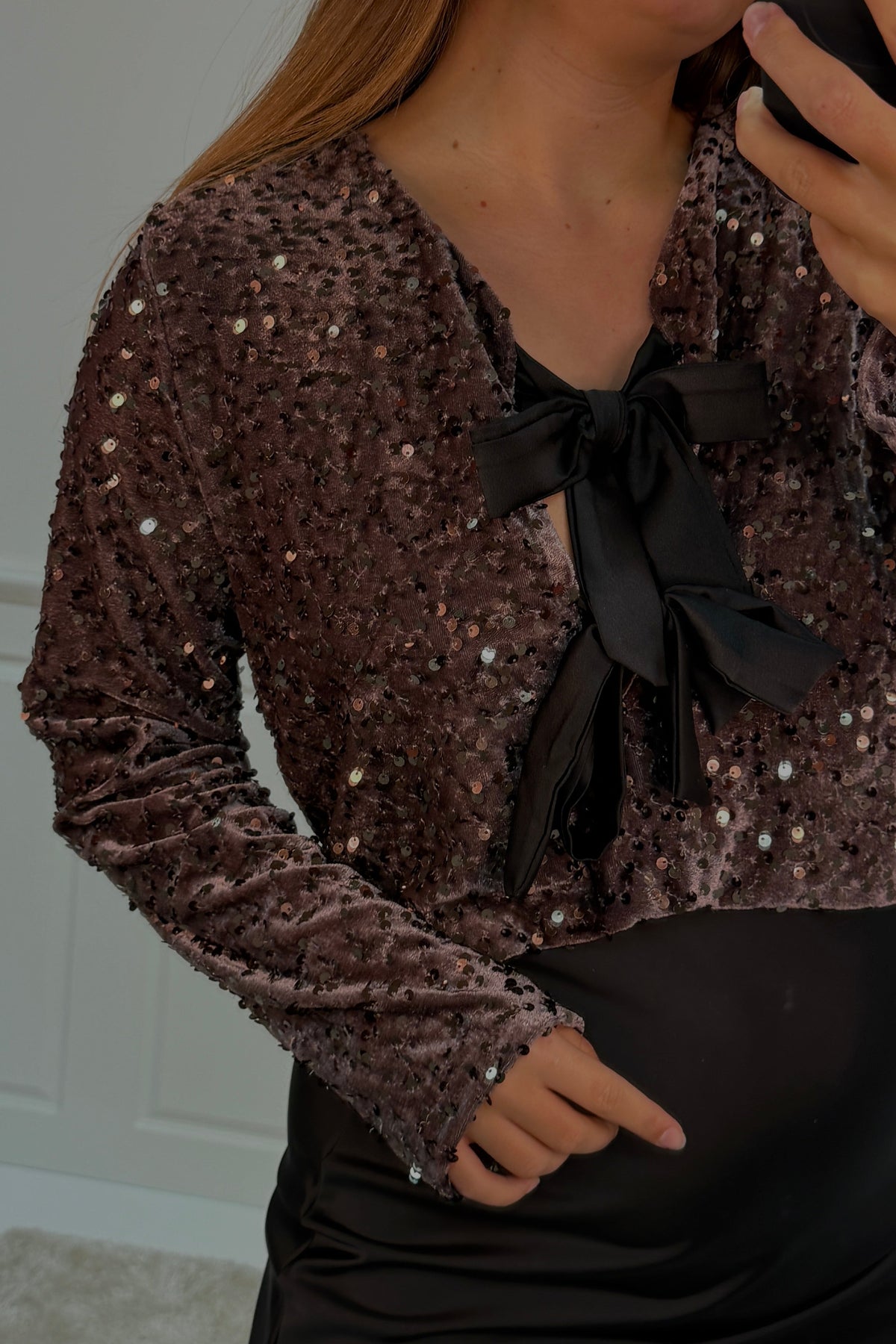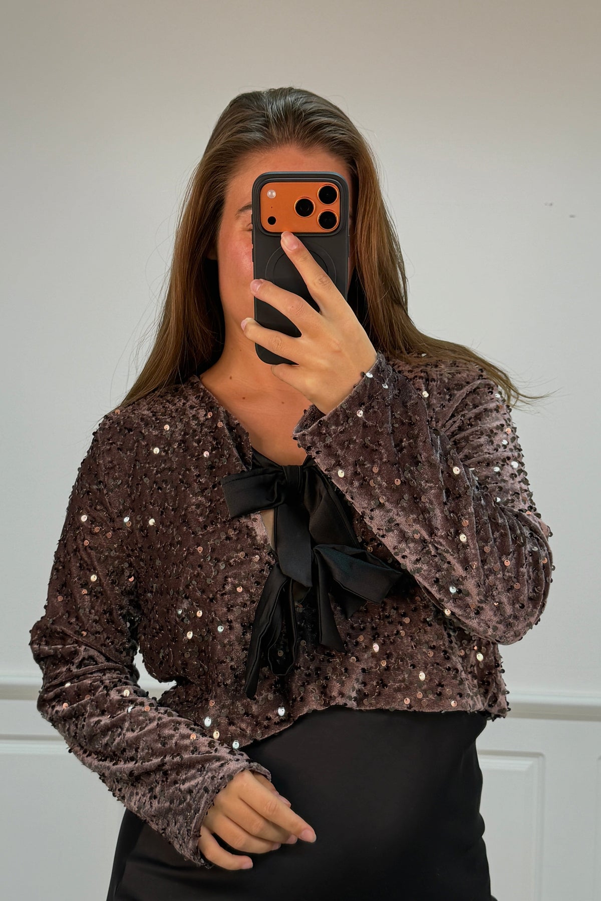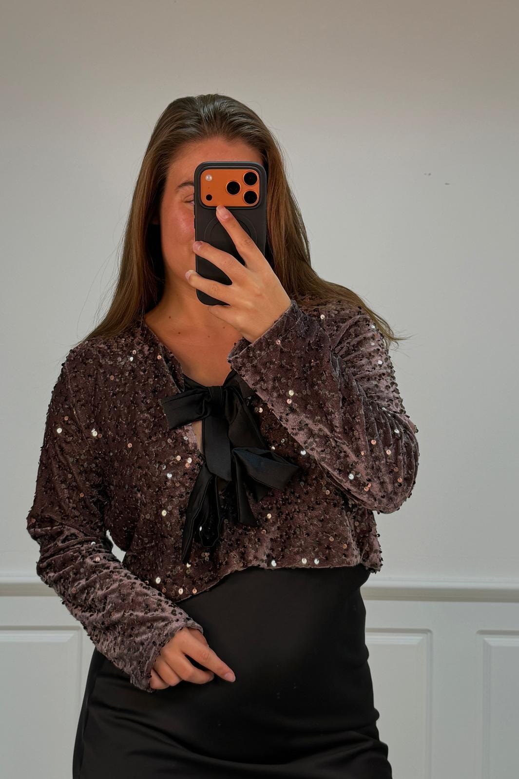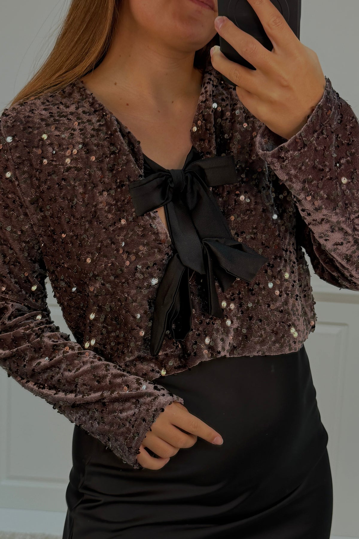 Festbluse fra A-bee i lys maroon med pailletter over hele stoffet. En V-udskæring med sort sløjfe og lange ærmer giver blusen et festligt præg.