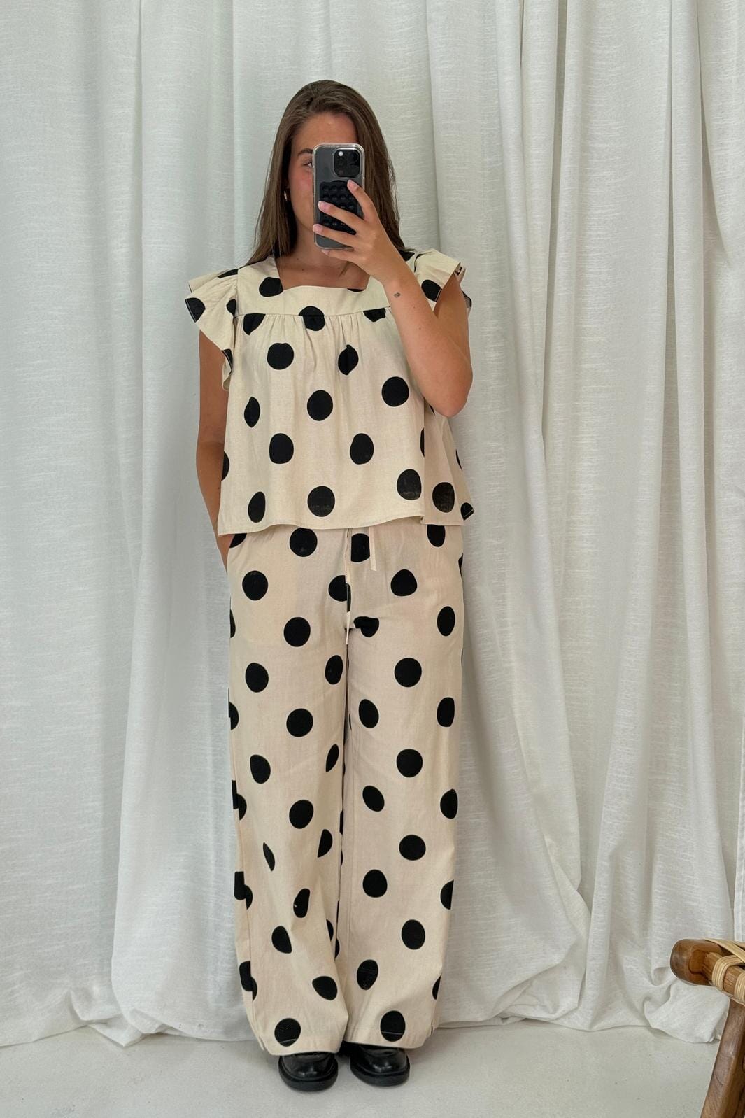 Bukser fra A-bee, lavet af en blanding af bomuld, viskose og linned i en lys ecru-nuance. Disse bukser har et polkaprikket mønster med store sorte prikker.