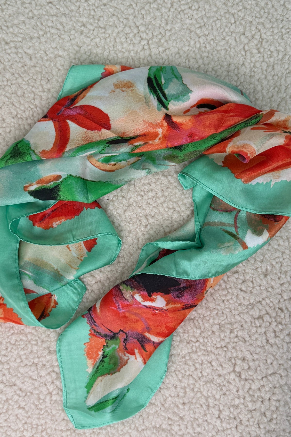 Grønt tørklæde fra A-bee med et blomstret print i orange, røde og grønne nuancer på en grøn baggrund.