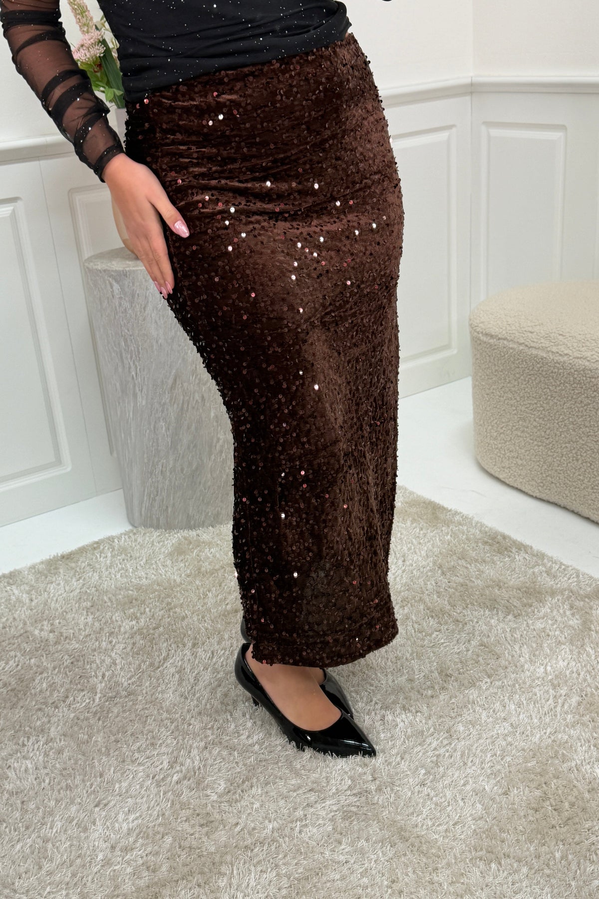 Nederdel fra A-bee i mørk bordeaux, dækket med pailletter over hele overfladen. Den høje talje og slanke pasform går ned til anklerne.