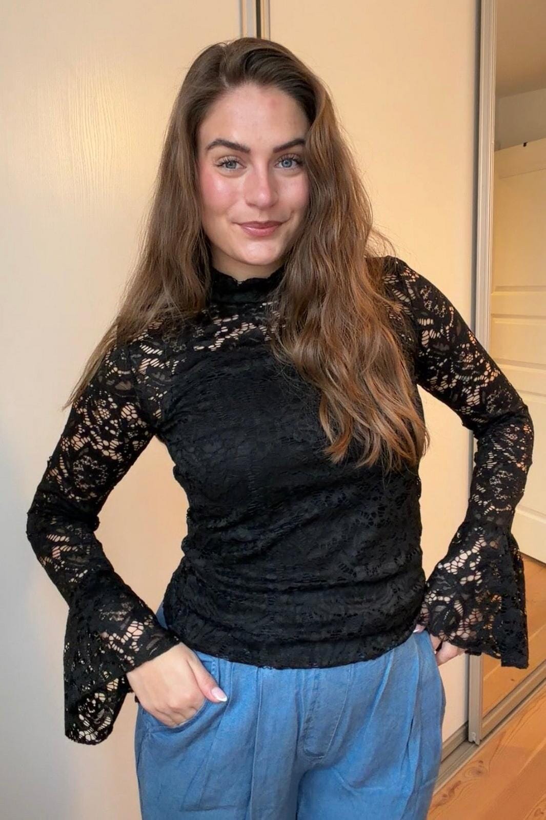 Sort bluse fra A-bee, lavet af polyamid og elastan. Blusen har blonde og flæser i stoffet.