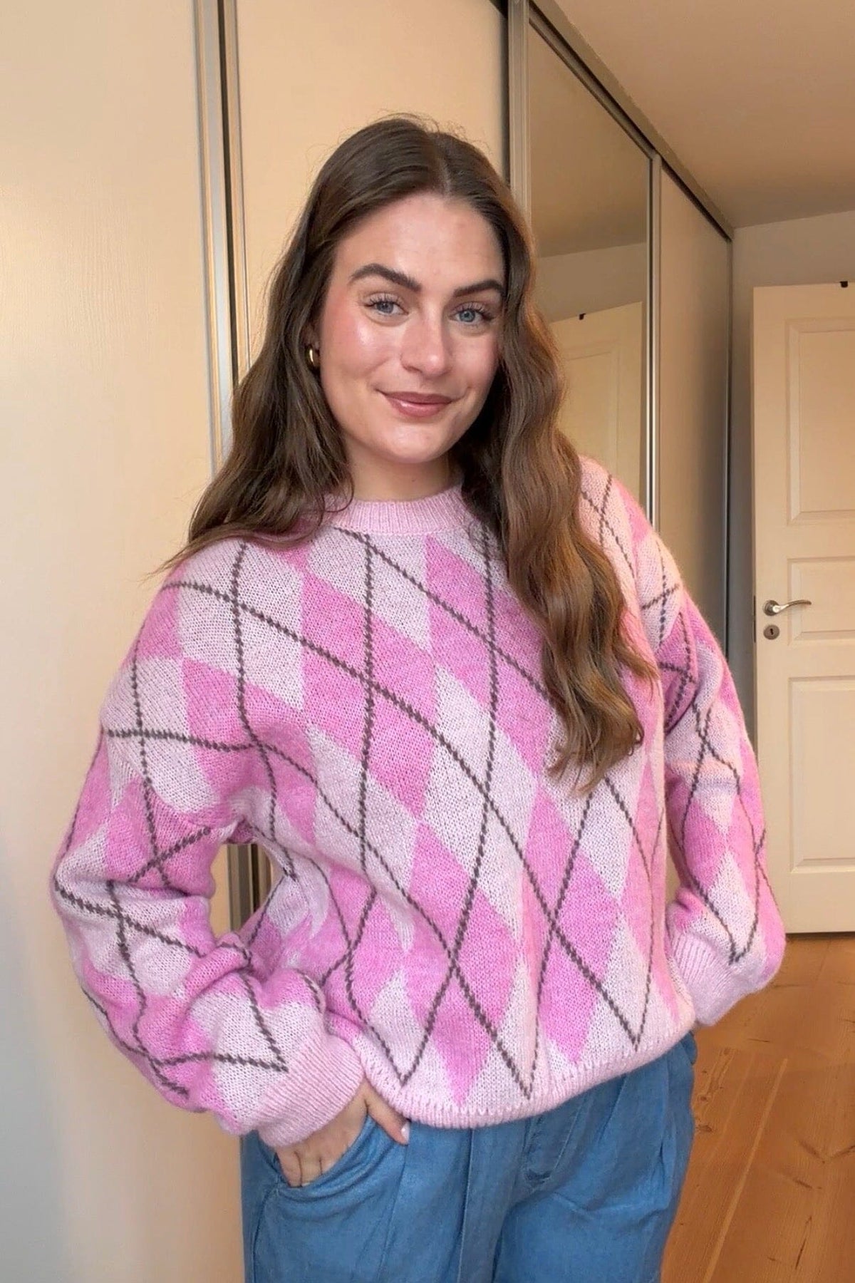 Striktrøje fra A-bee i lyserøde og lilla nuancer med et ternet argyle-mønster. Trøjen har en løs pasform og lange ærmer.