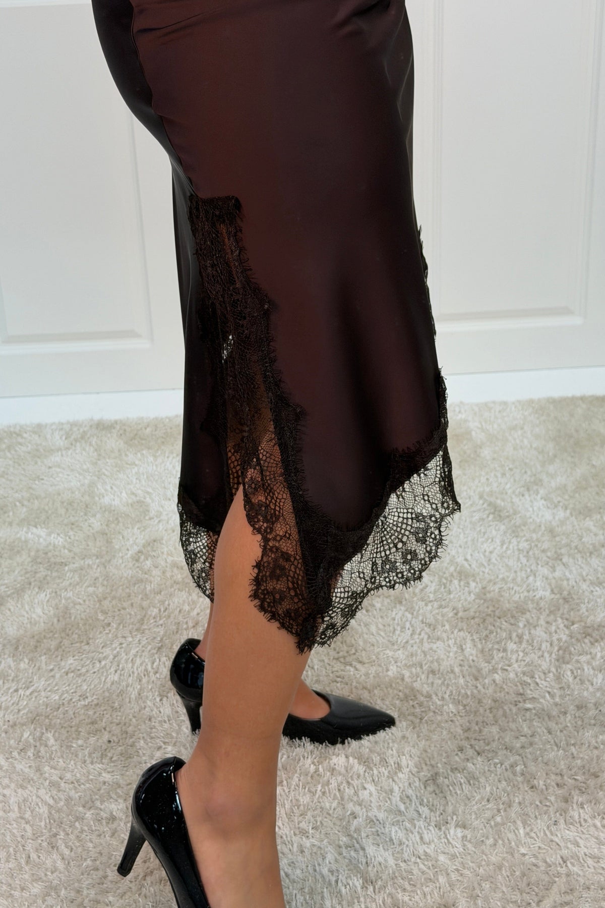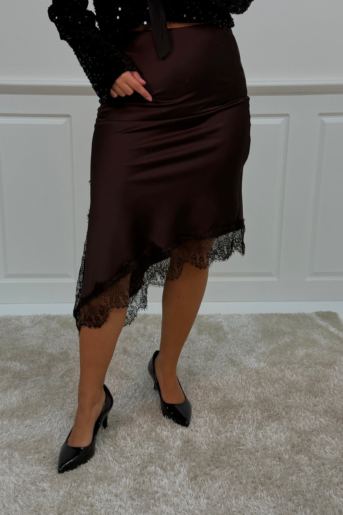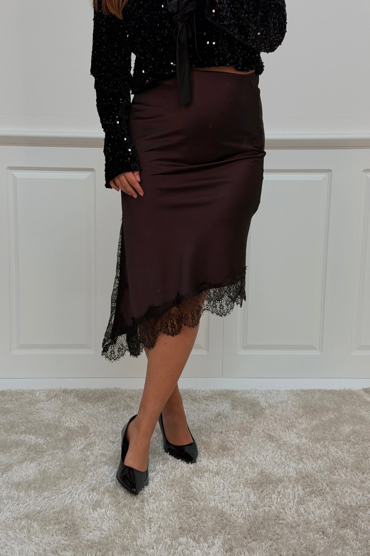Brun nederdel fra A-bee med blondedetaljer langs kanten. Nederdelen er lavet i viskose og har en længde til læggen med almindelig taljehøjde.