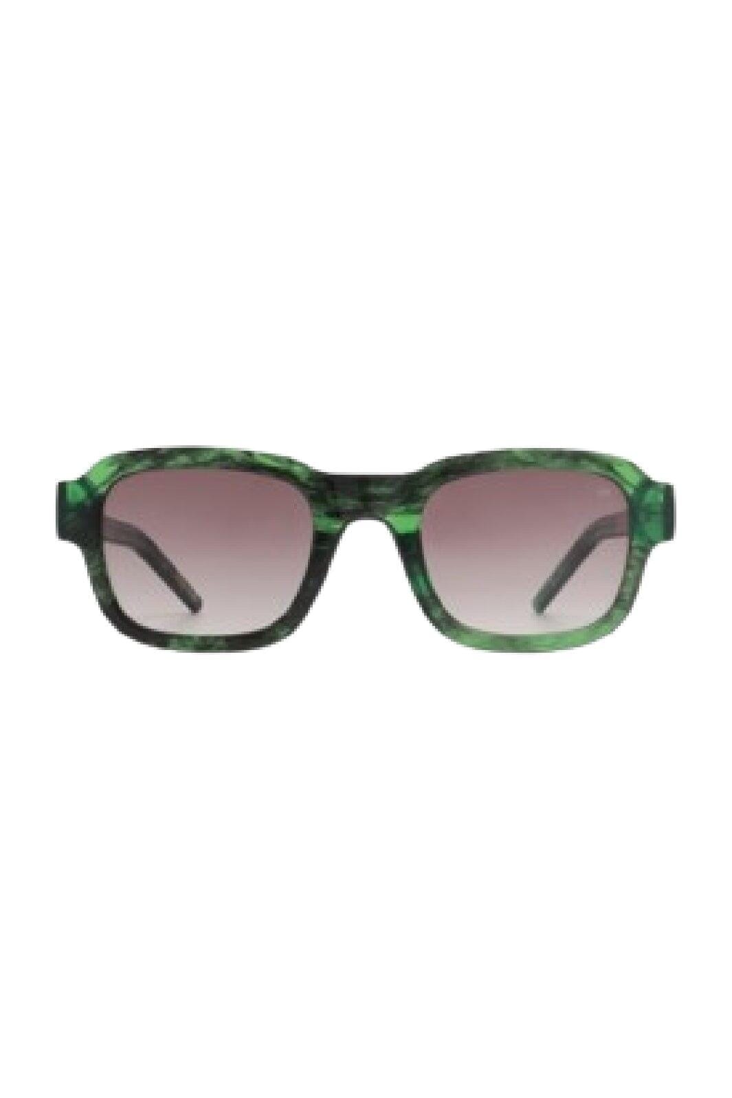 Solbriller fra A. Kjærbede med grøn marmoreret, transparent stel. Brillerne har UV400-beskyttelse og er udstyret med optiske kvalitetshængsler samt formbare brillestænger med metalkerner.