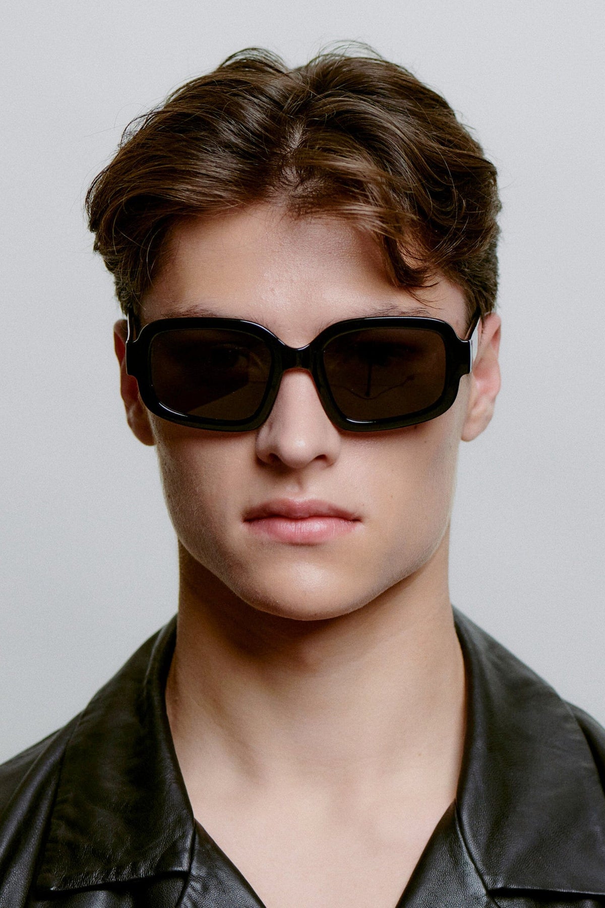 Sorte solbriller fra A. Kjærbede med rektangulær ramme. Stellet har kraftige linjer med bløde kurver, og de mørke linser giver et vintagepræg.