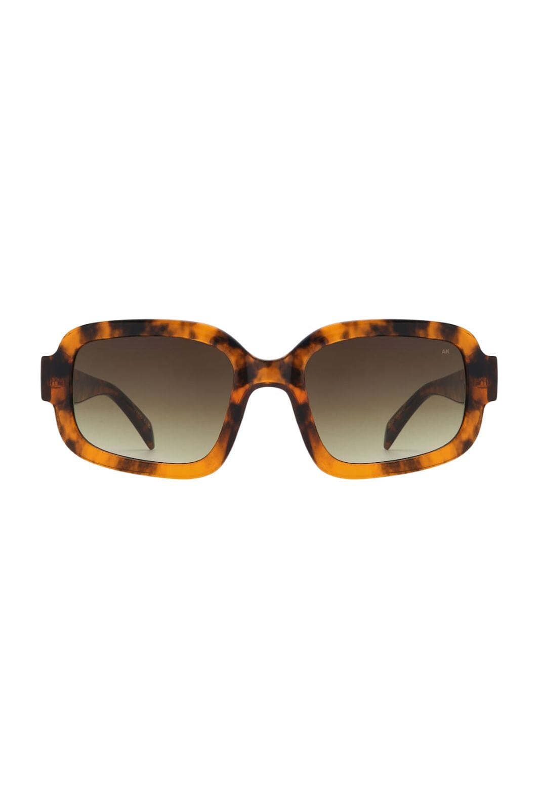 Solbriller fra A. Kjærbede med firkantet stel i brun Havana-farve. Stellet har et skildpaddemønster og tonede gradientlinser med en kraftig ramme.