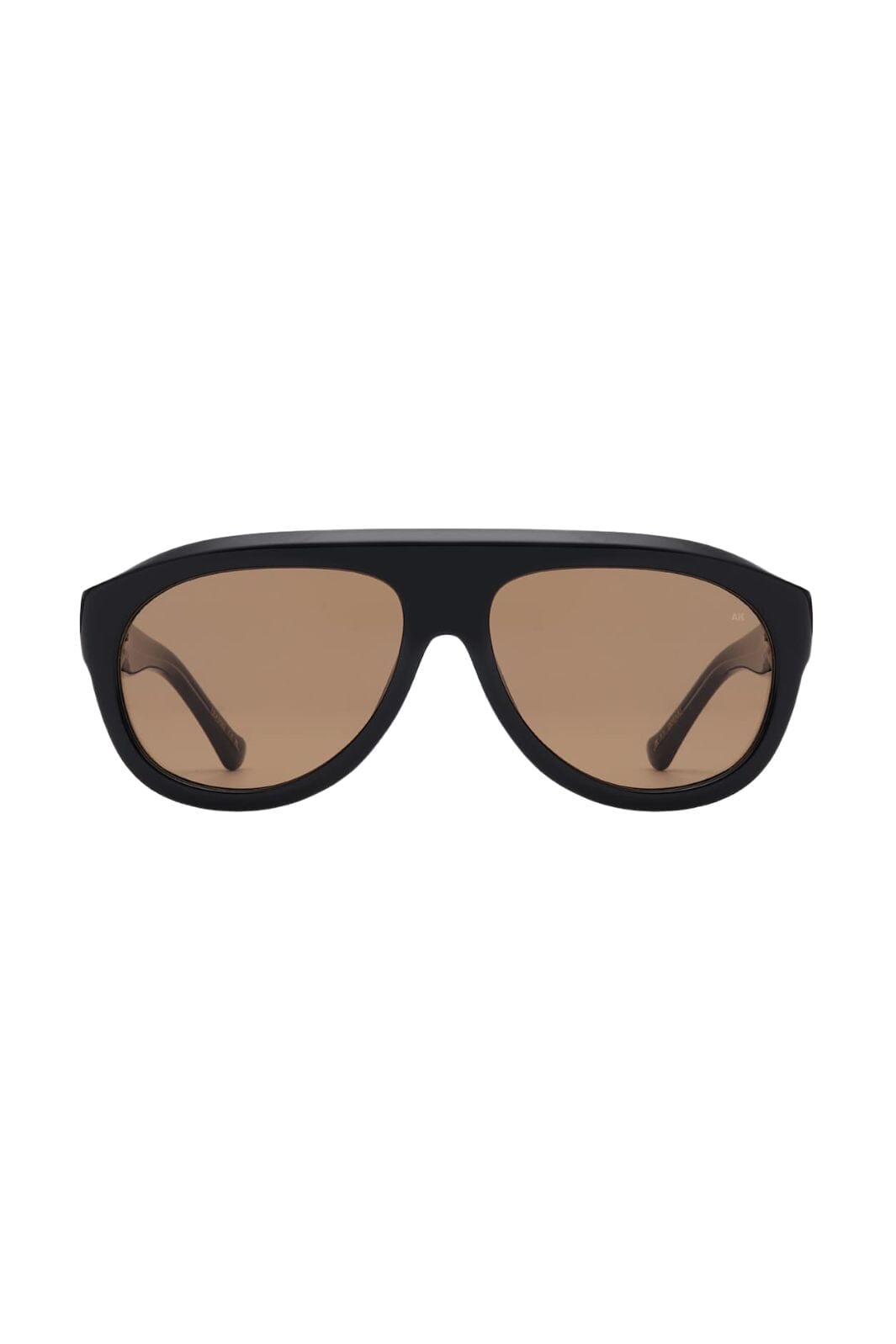 Sorte solbriller fra A. Kjærbede med aviator-inspireret stel. Brillerne har en bred, skulptureret form med brune linser og en markant bro på 16 mm.