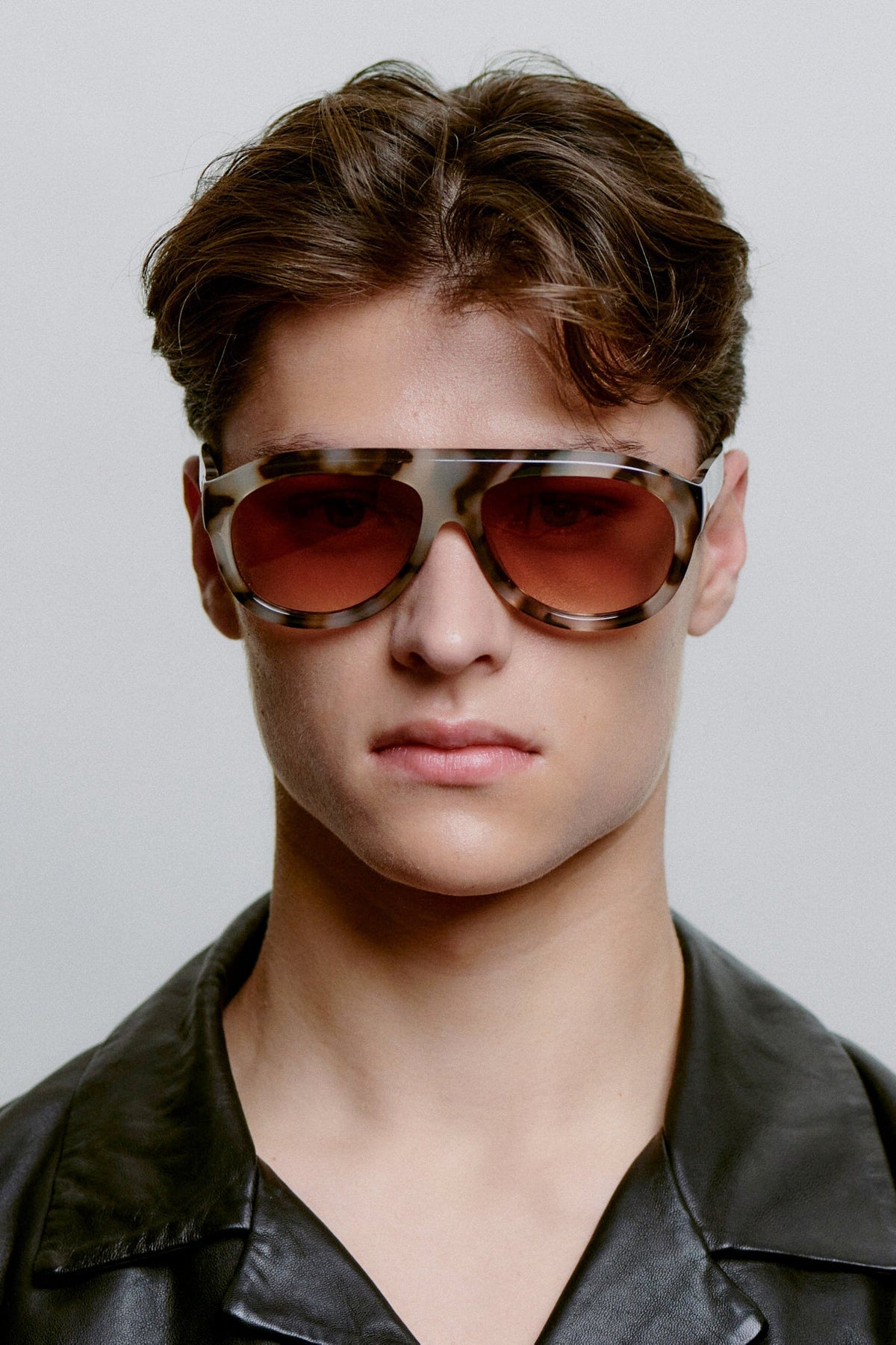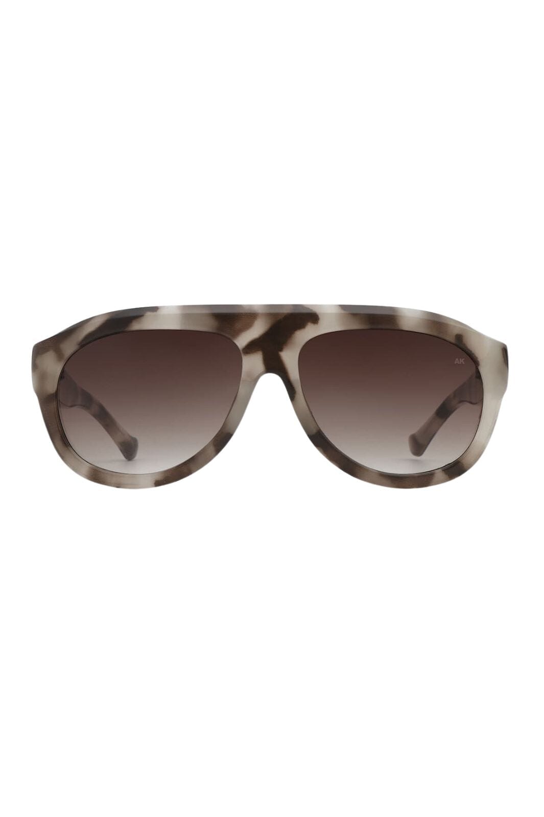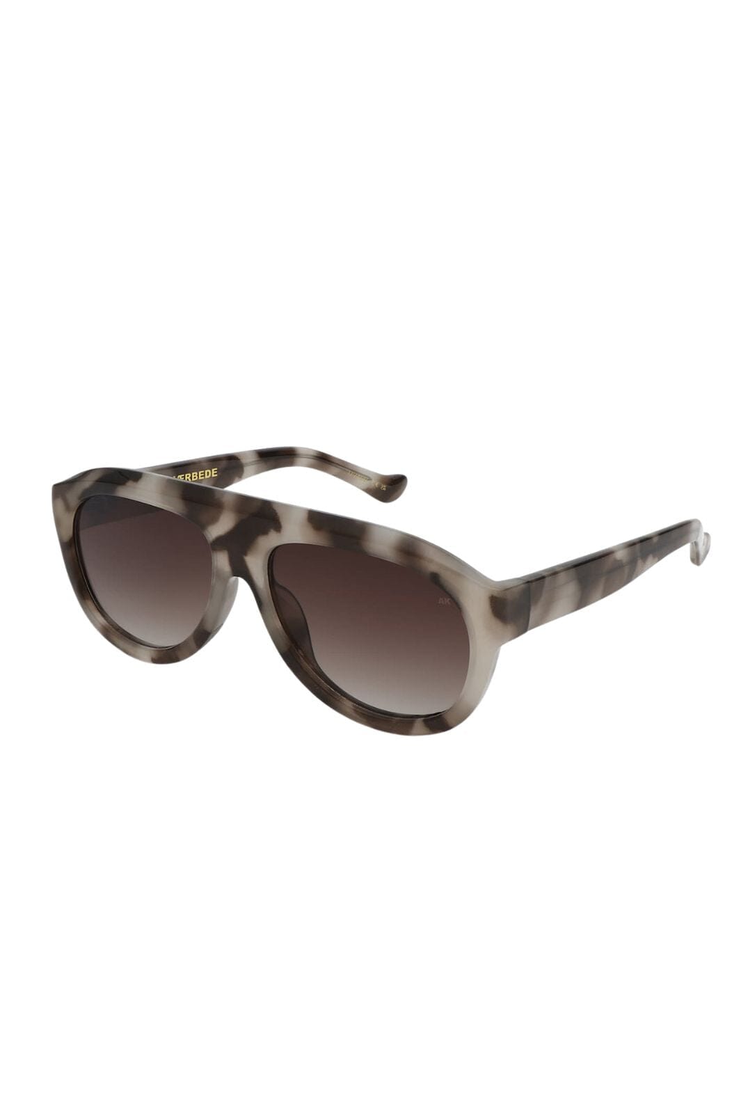 Solbriller fra A. Kjærbede med mønstret stel i brune og grå nuancer. Stellet har en aviator-form med gradientlinser og et karakteristisk Cookie Dough-farvet design.