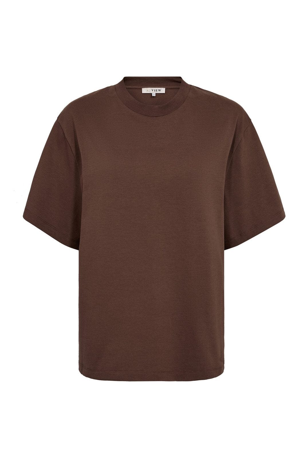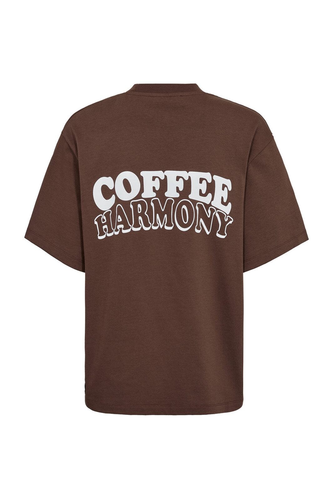 Brun t-shirt fra A-View med et stort COFFEE HARMONY-print på ryggen. T-shirten har en løs pasform og er lavet af økologisk bomuld med rund hals.