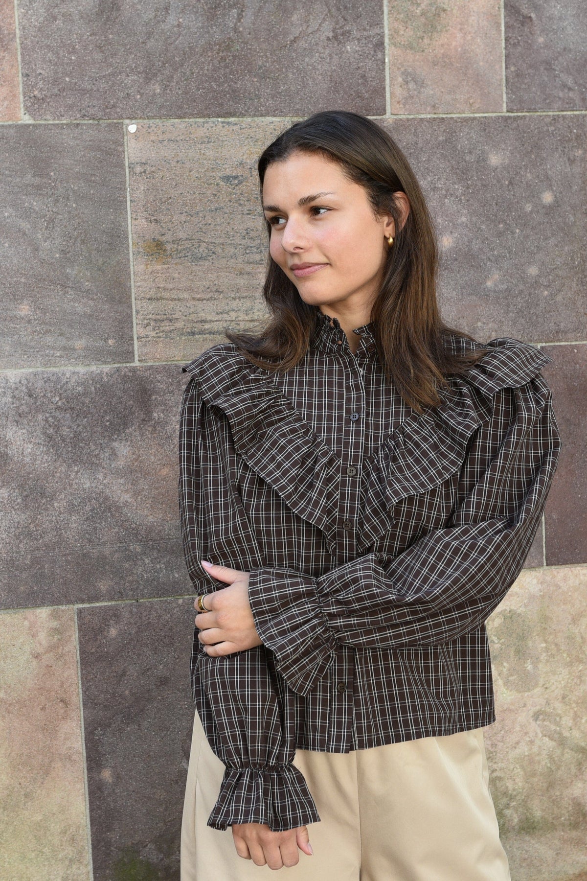 Ternet skjorte fra A-View i brune og sandfarvede nuancer. Skjorten har et oversized snit med ruffledetaljer på brystet og lange ærmer, der passer til både hverdag og festlige lejligheder.