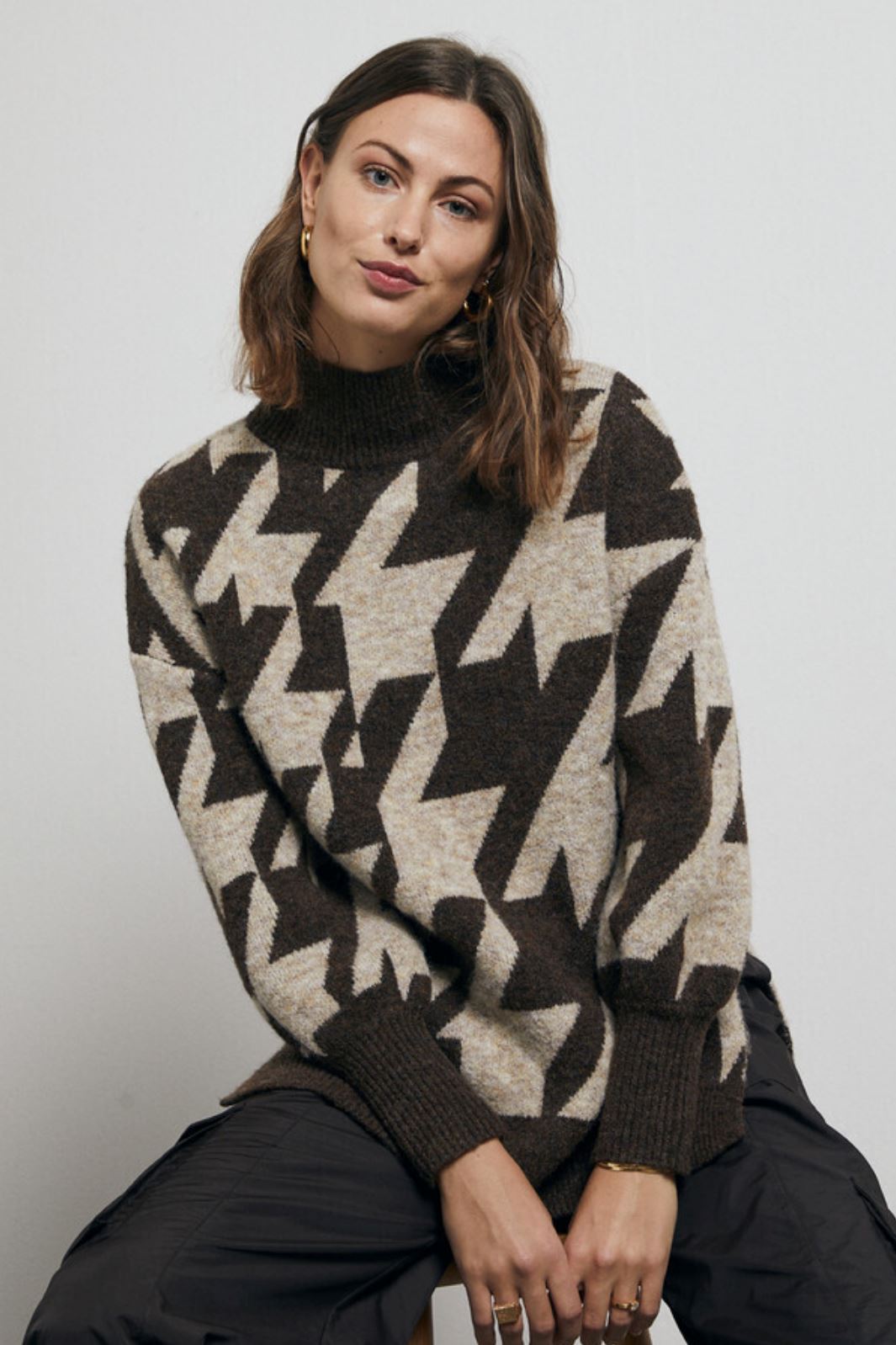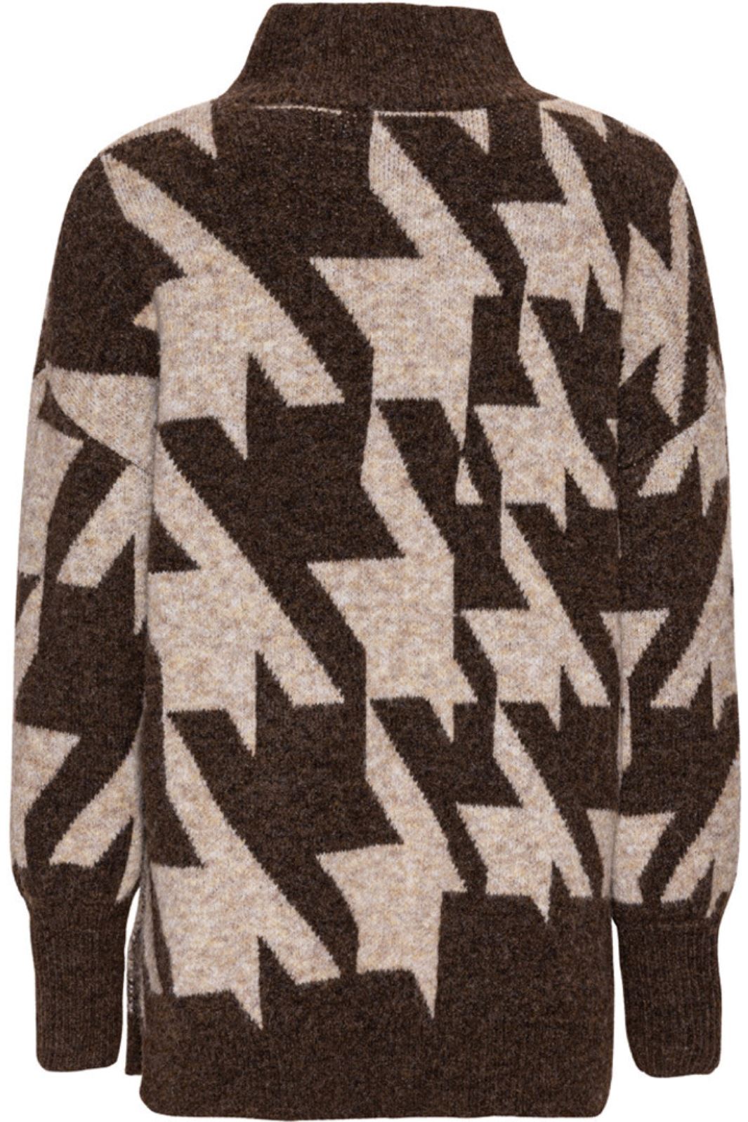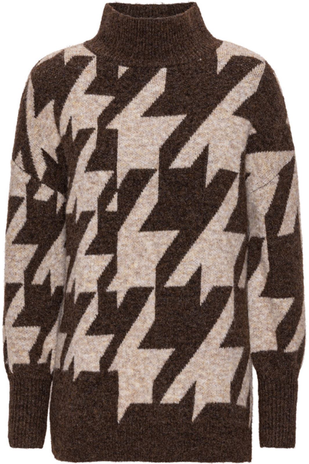 Hounds knit pullover er en oversize strik i et houndstooth print. Den har en høj rund hals, lange ærmer og et slids i siden som gør den ekstra detaljerig.