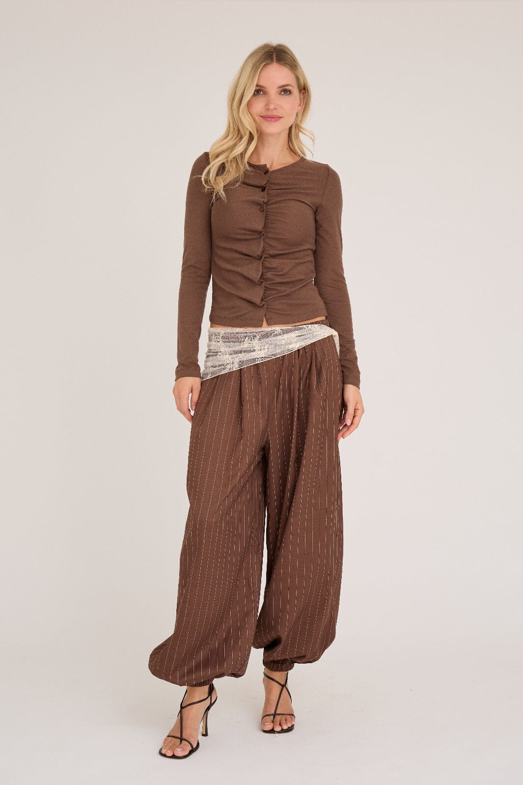 Brune bukser fra A-View med striber og løs pasform. Bukserne har ankellængde og kombinerer snøre- og knaplukning i taljen med elastik ved anklerne.