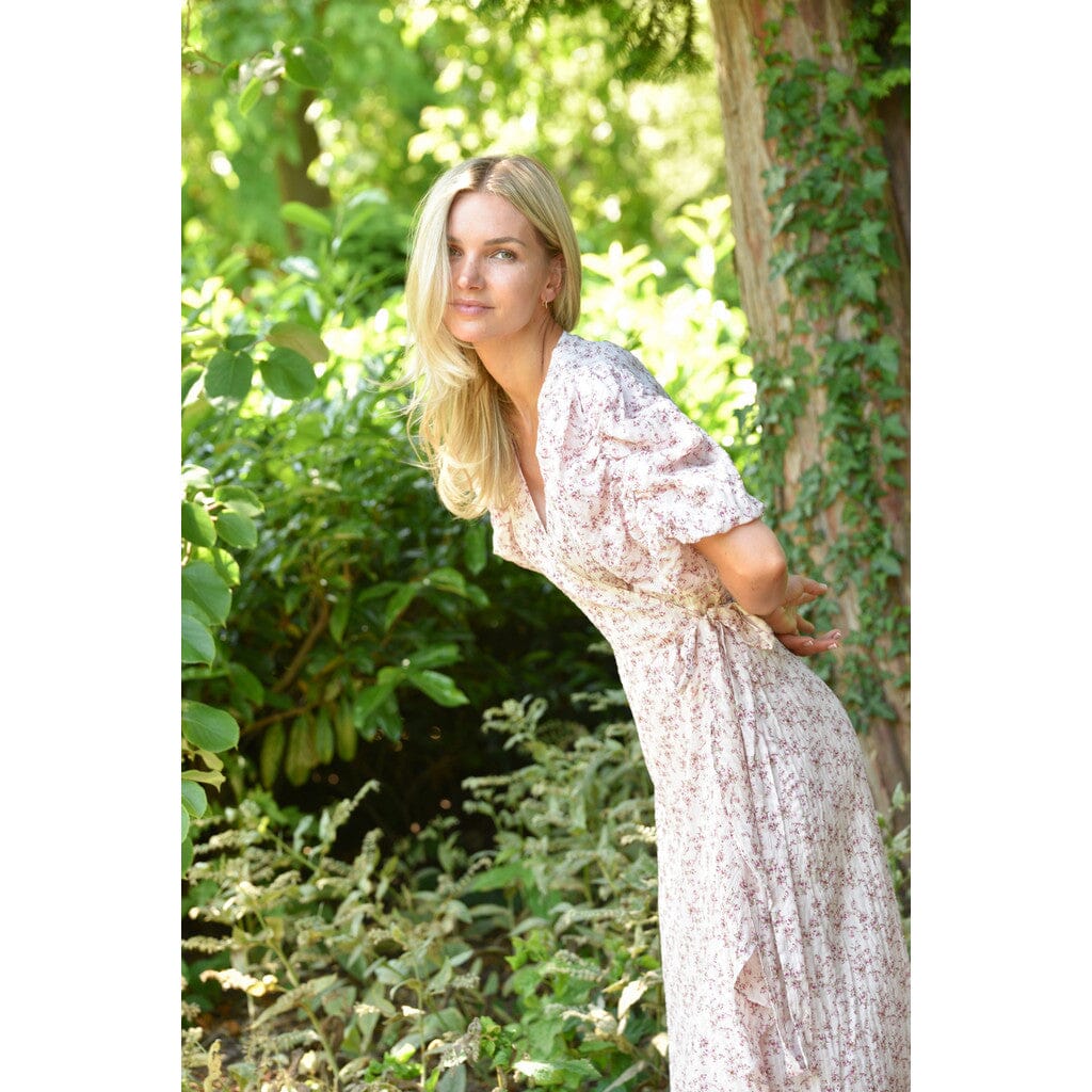 Kjole fra A-View med blomsterprint i rose- og pinknuancer. Kjolen har puffede, korte ærmer og en V-udskæring med slå-om-design.