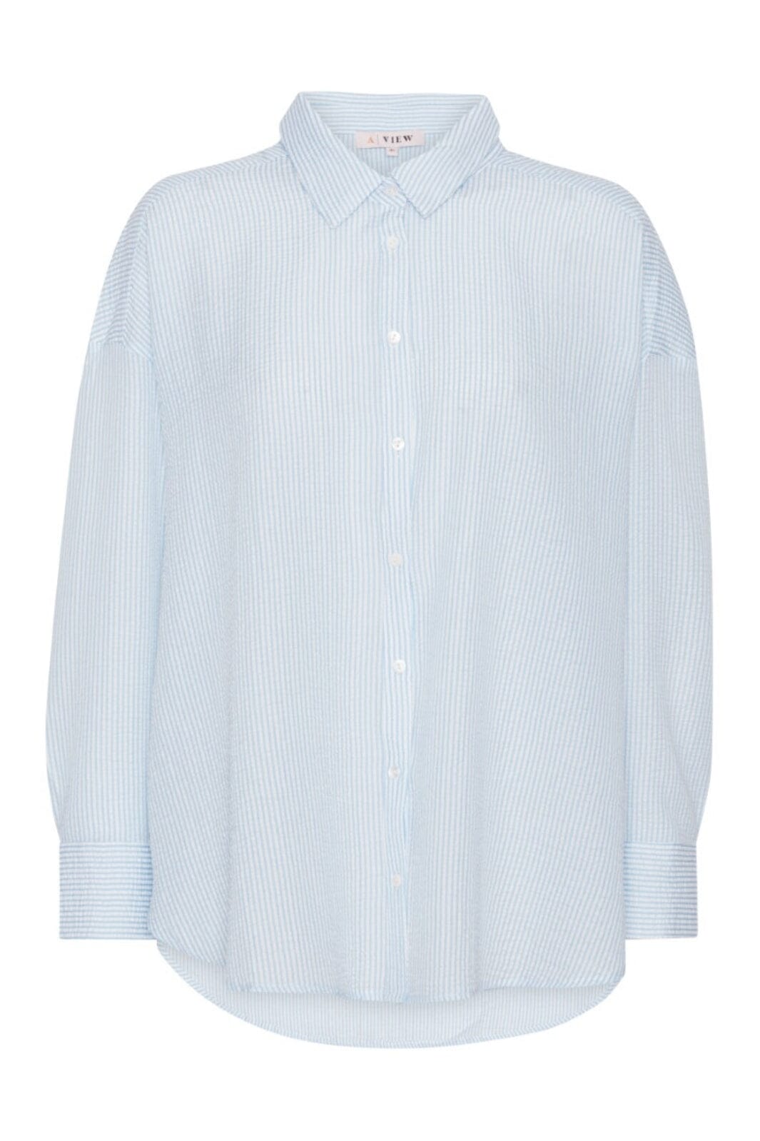 Stribet skjorte fra A-View med blå og hvide striber. Skjorten har en oversize pasform med lange ærmer, skjortekrave og knaplukning hele vejen ned.