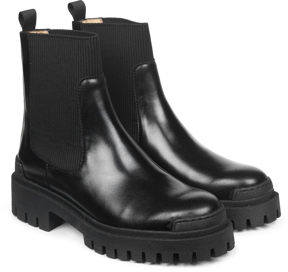 Fed ankel støvle fra Angulus i sort læder med indvendig glat skind foring. Støvlen har elastik i siderne samt øverst fortil. 4 cm tyk chunky bund og skafthøjde på 15 cm.