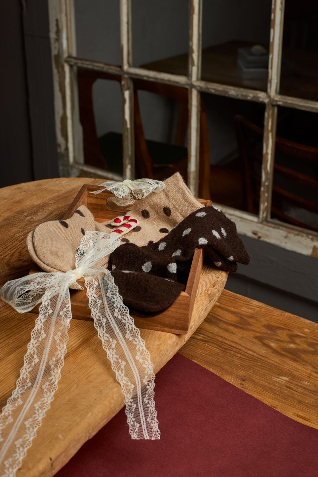 Sokker fra Black Colour i mørkebrun med hvide polkaprikker. Sokkerne har mellemhøj skaftlængde og er fremstillet af en blød materialeblanding med uld.