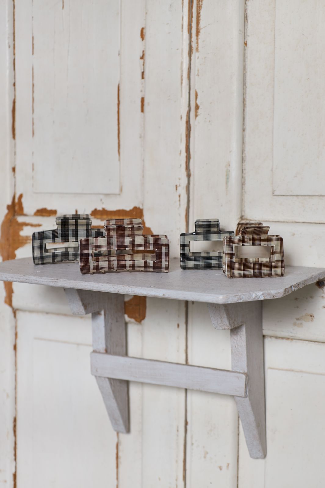 Hårklemme fra Black Colour med et sort og hvidt ternet mønster. Klemmen er lavet af akryl og har en buet form.