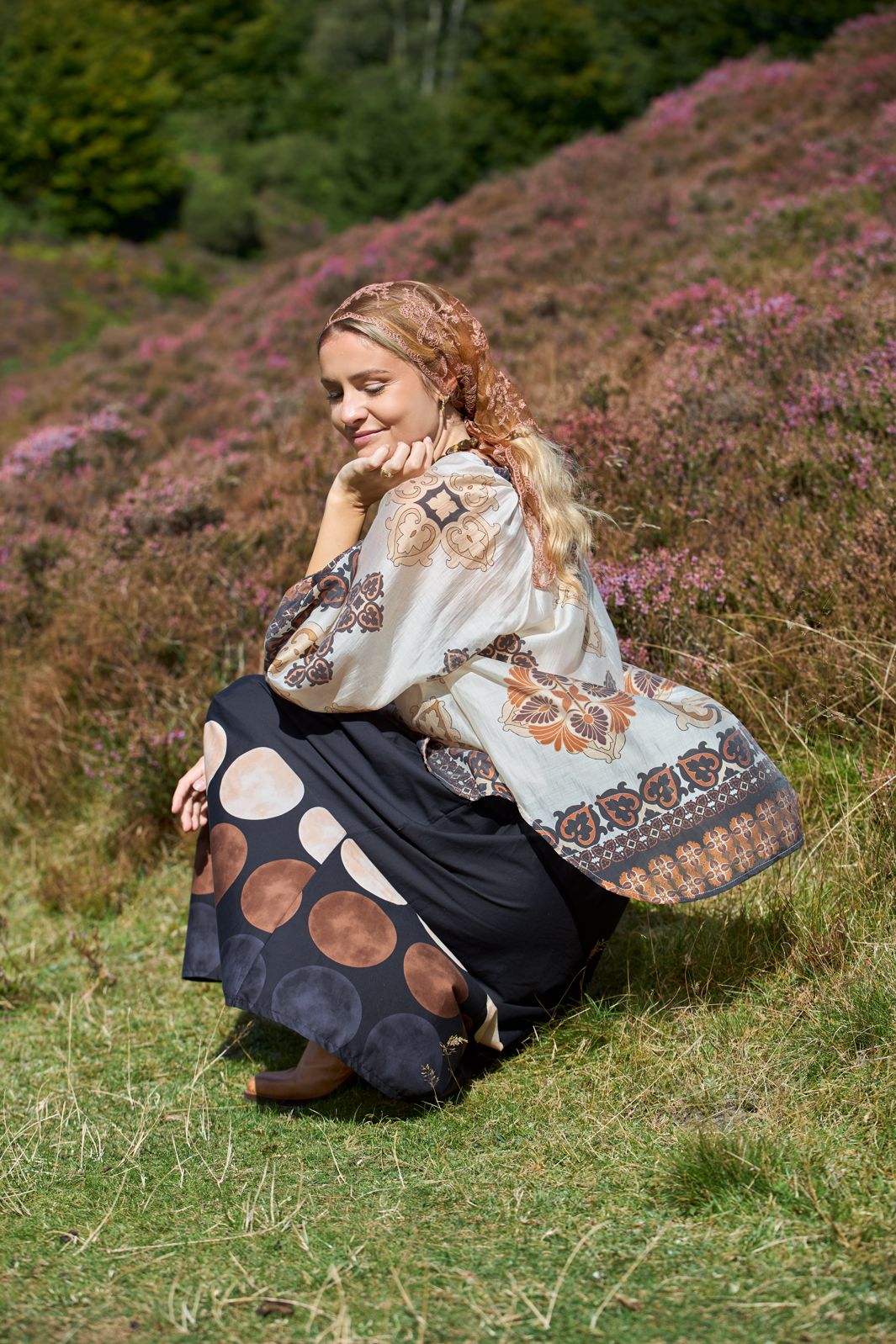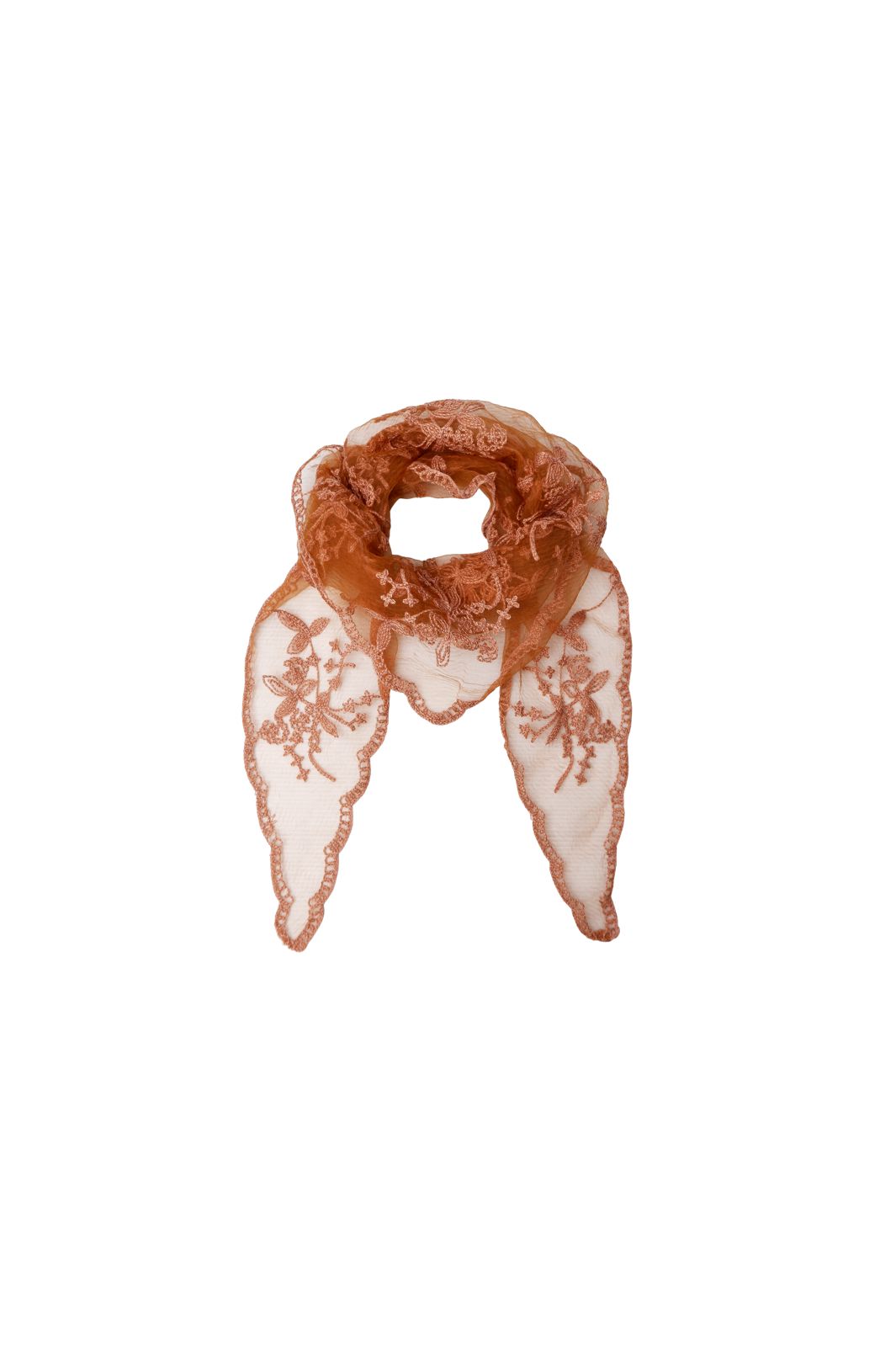 Trekantet tørklæde fra Black Colour i tobaksfarvet nuance. Tørklædet har et gennemsigtigt blondemateriale med blomsterbroderi over hele fladen.