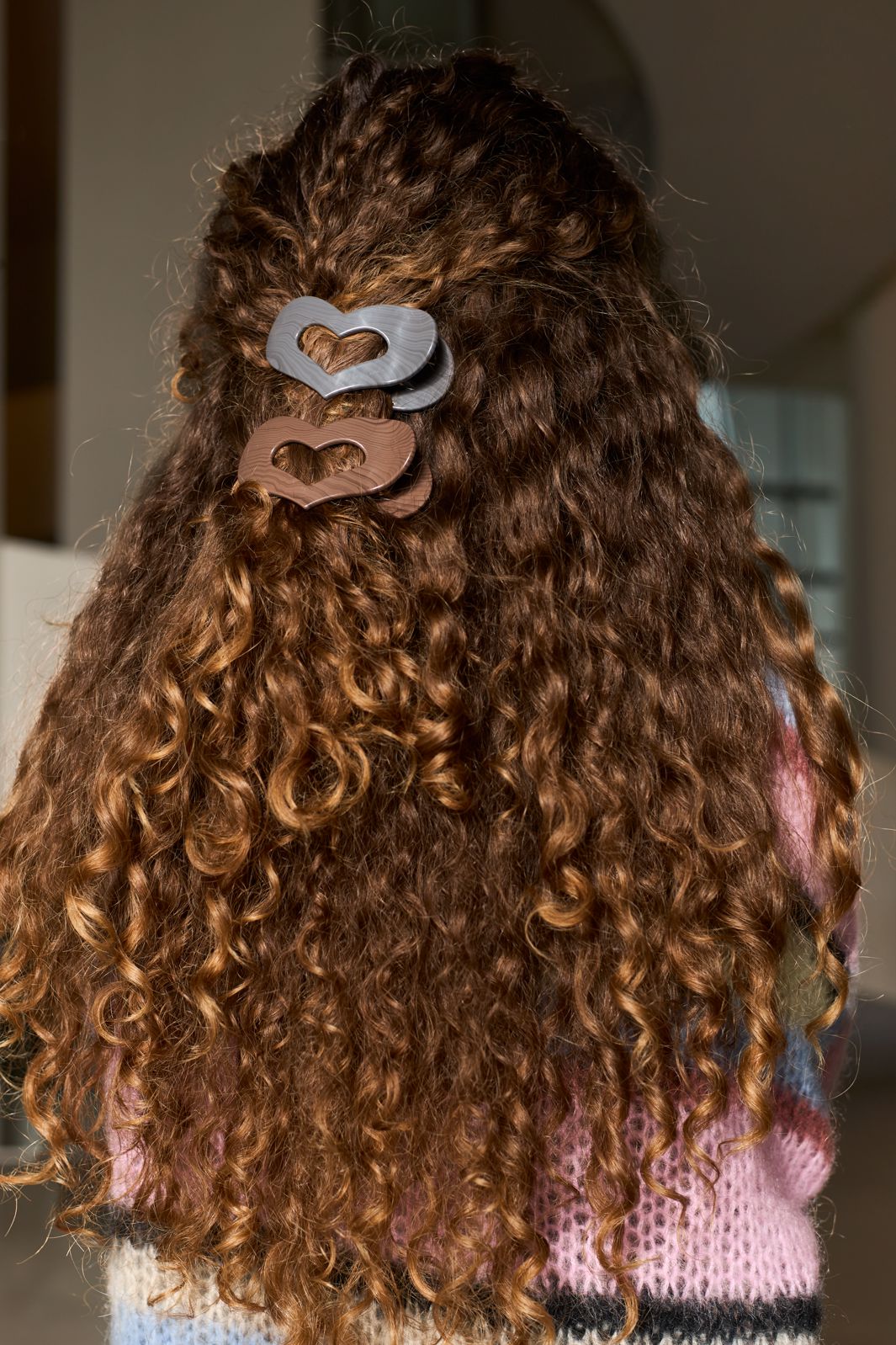 Hårklips fra Black Colour i grå med et hjerteformet design og en glat, skinnende overflade. Klipsen har en central åbning i hjerteformen.