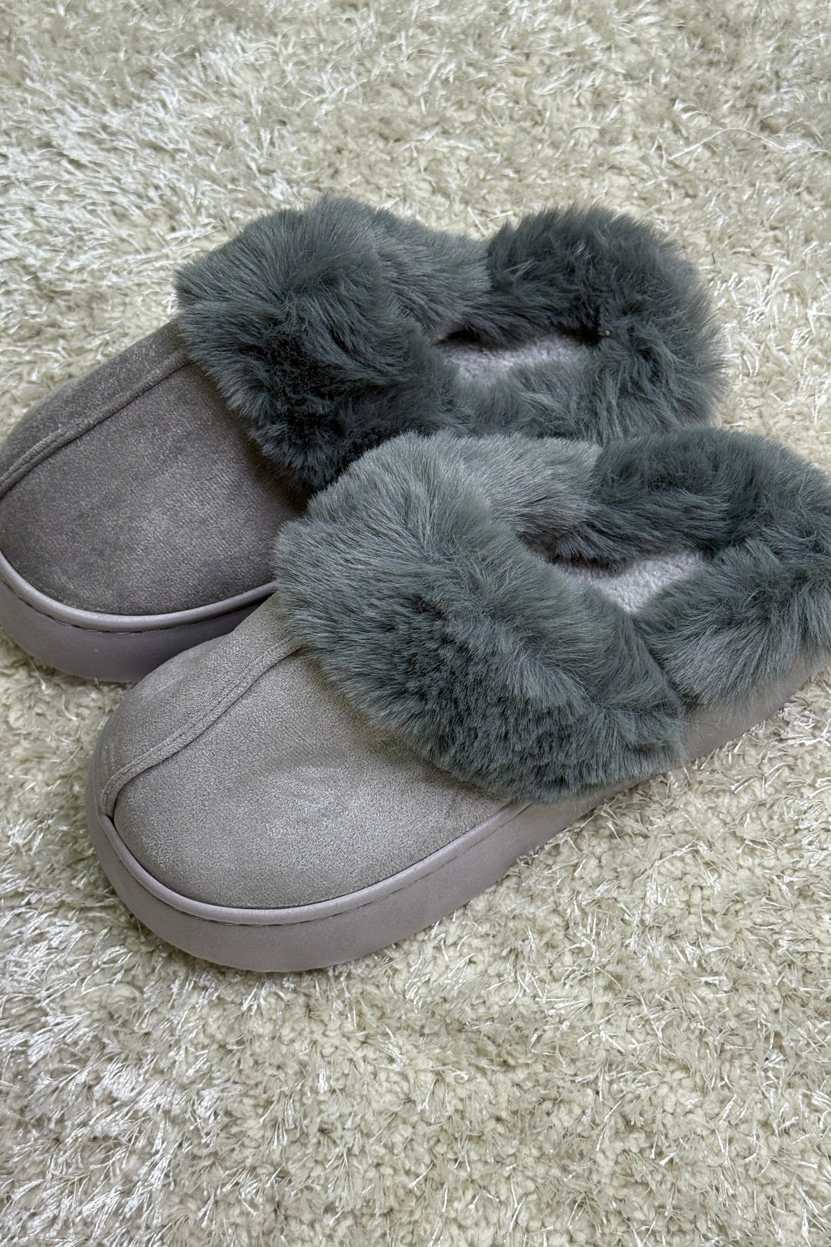 En lys grå hjemmesko fra Bloom, lavet af syntetisk materiale. Slipperen har en lav hæl og en rund tå.