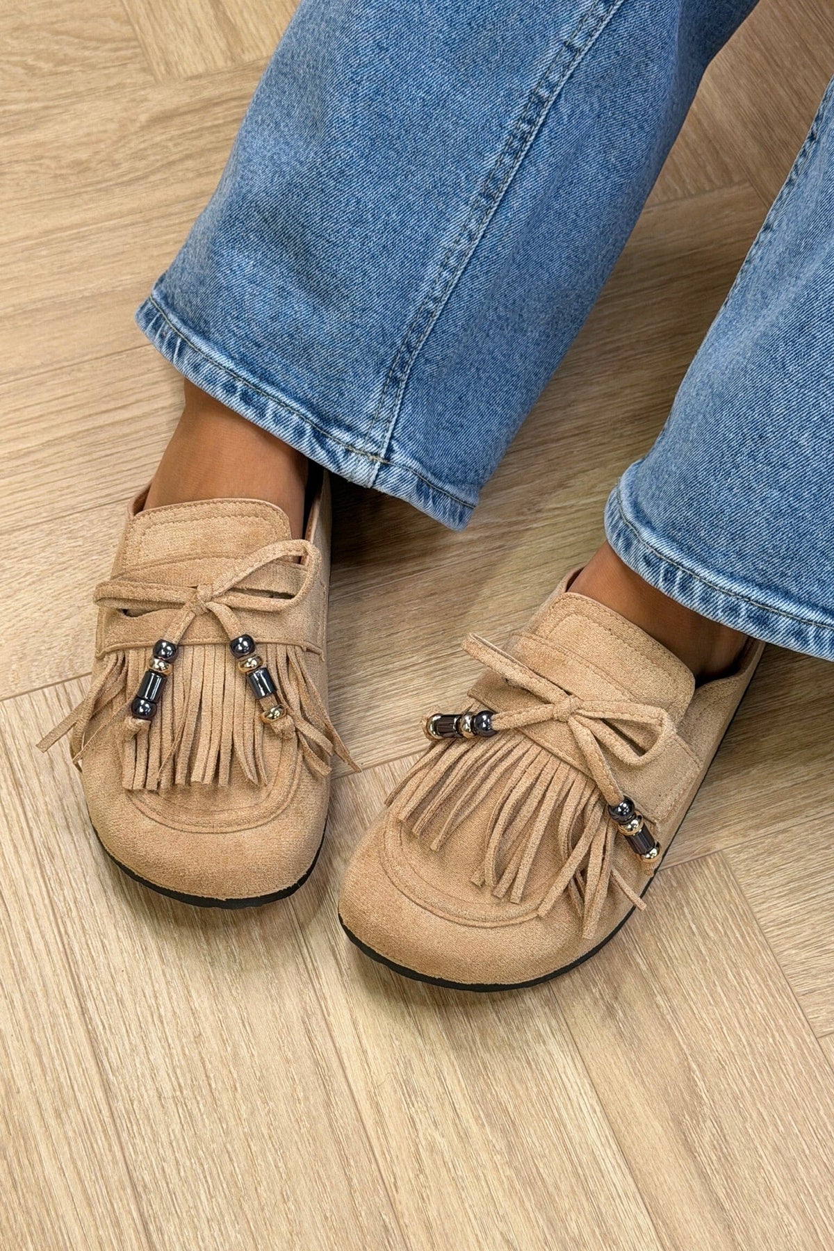 Loafers fra Bloom i taupe med slip-on design. Dekorative kvaster med perler på forsiden og åben hæl giver et afslappet udtryk.