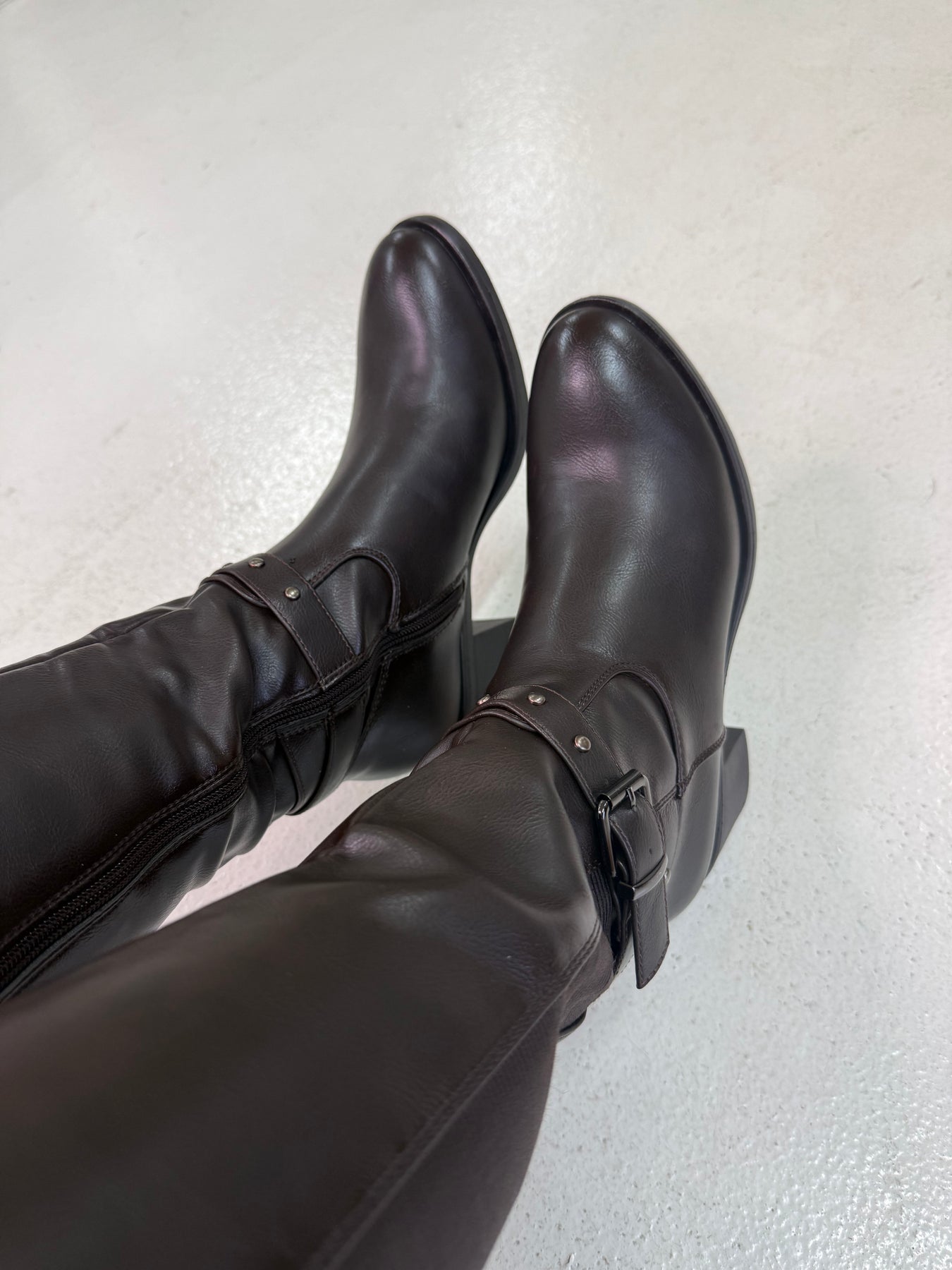 Knæhøje støvler fra Bloom i chokoladebrun PU. Støvlerne har en blokhæl og en dekorativ rem med spænde omkring anklen.