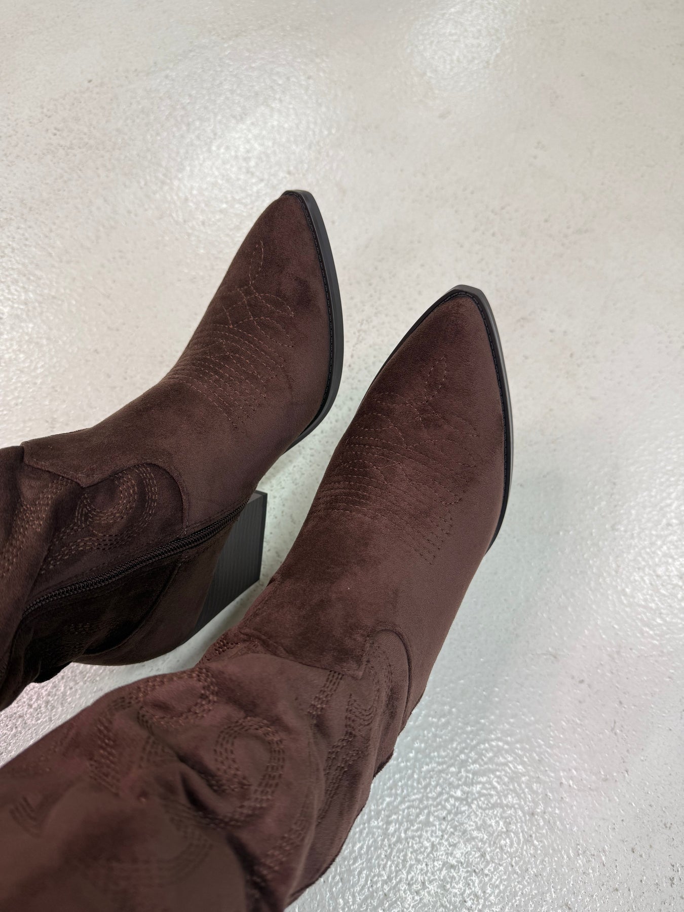 Støvler fra Bloom i brun med dekorative syninger langs skaftet. Støvlerne har en blokhæl og en spids tå.