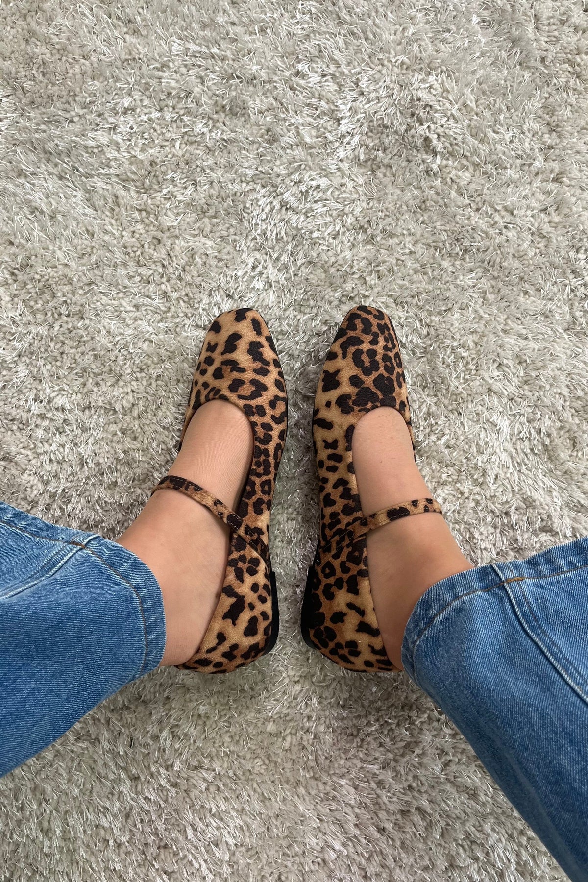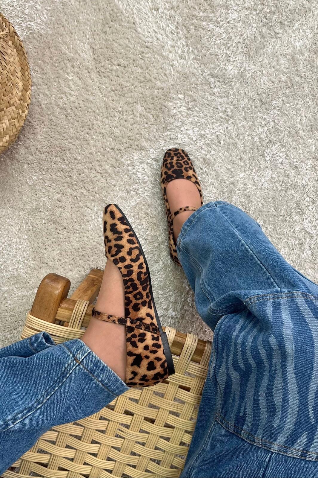 Ballerina fra Bloom med leopardprint i brune og sorte nuancer. Skoen har mandeltå og en praktisk spænderem over vristen.