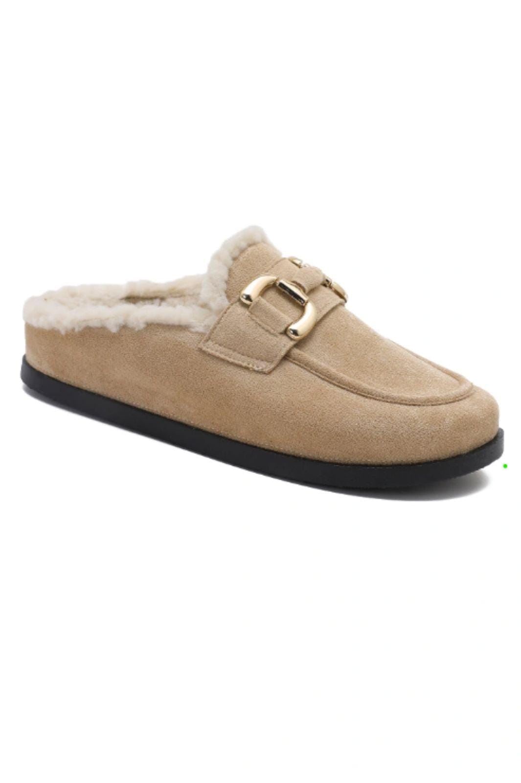 Hjemmesko fra Bloom i taupe med gyldent spænde på oversiden. Den hvide, bløde plysforing og den sorte sål giver en praktisk kombination af komfort og holdbarhed.