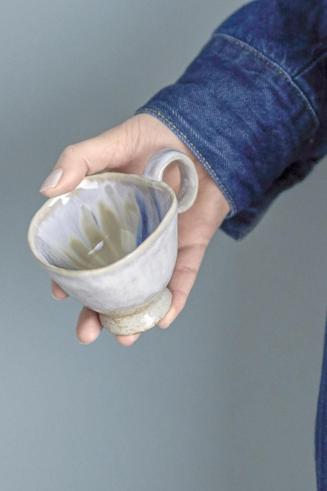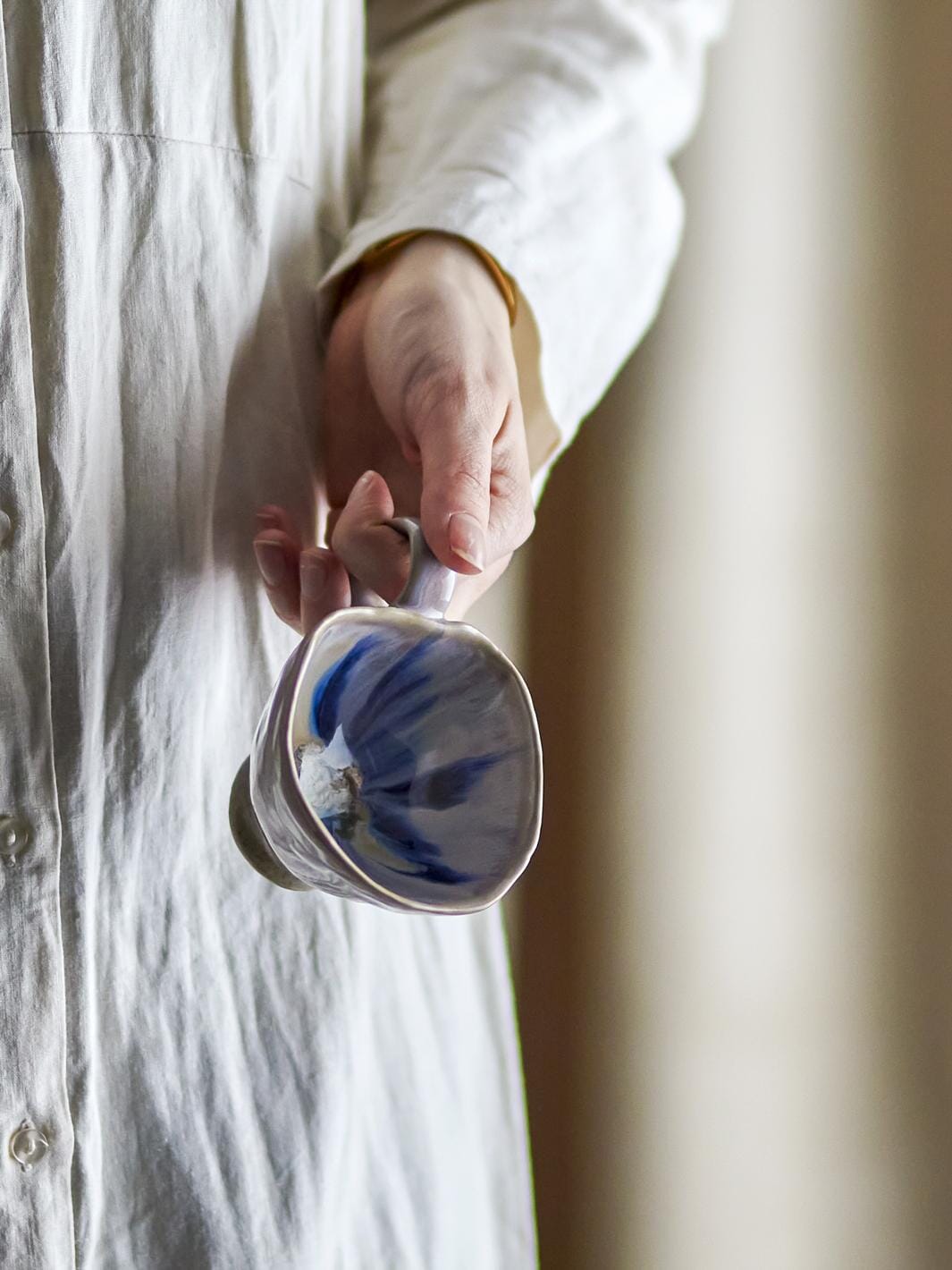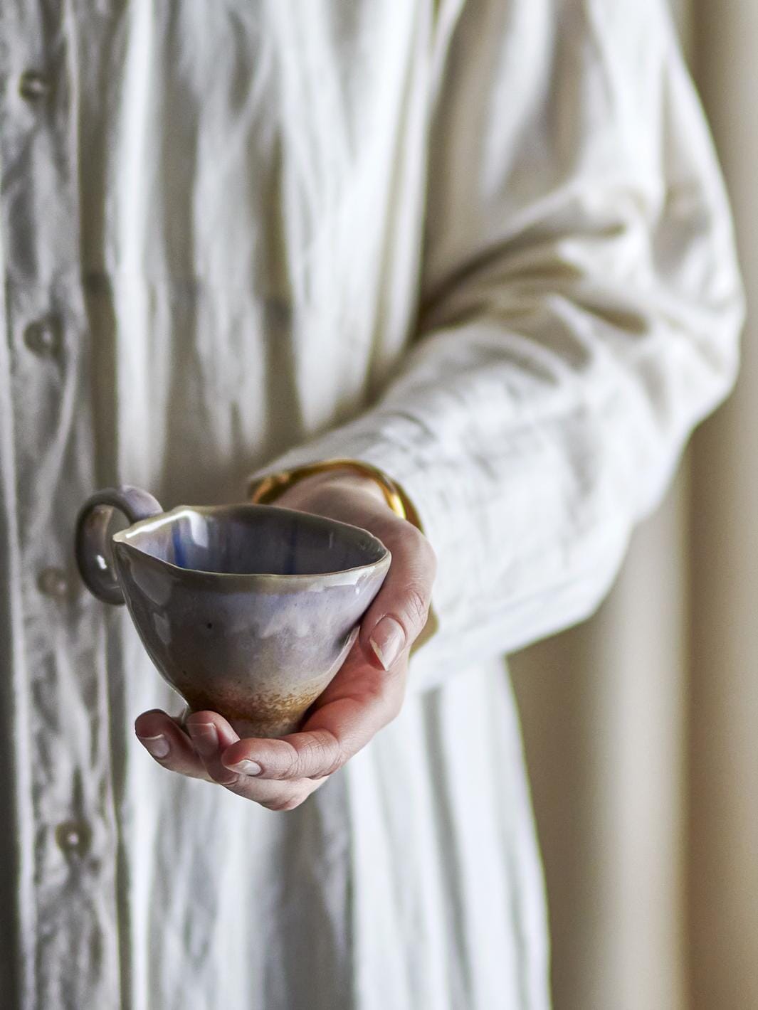 Kop fra Bloomingville, fremstillet af stentøj med multifarvet glasur i nuancer af blå, beige og grå. Koppen har en bred åbning og en smal fod.
