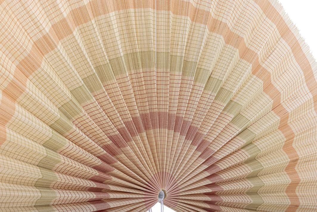 Vifteformet vægdekoration fra Bloomingville i bambus med hvid kvast. Den store dekoration har gule, beige og lyserøde nuancer.