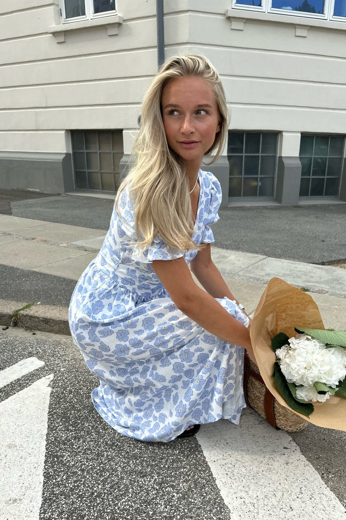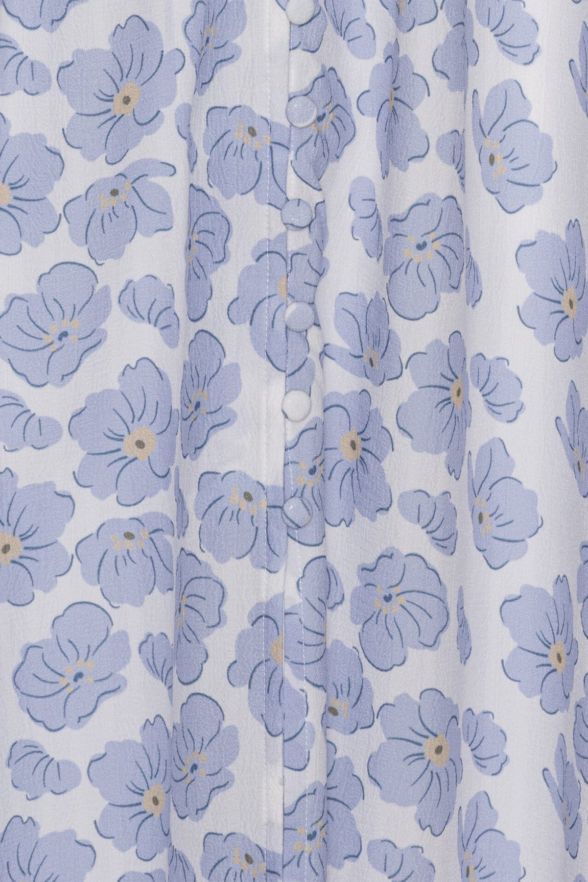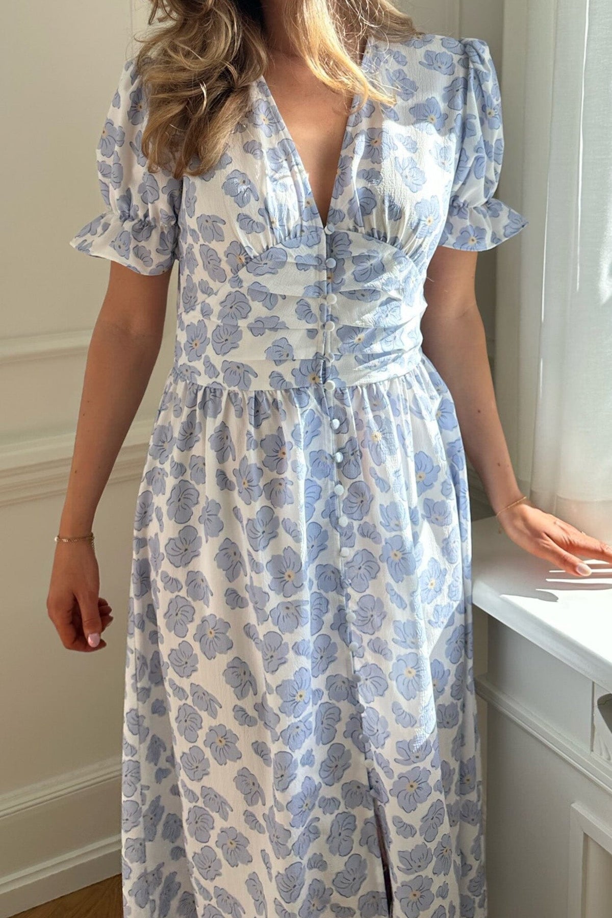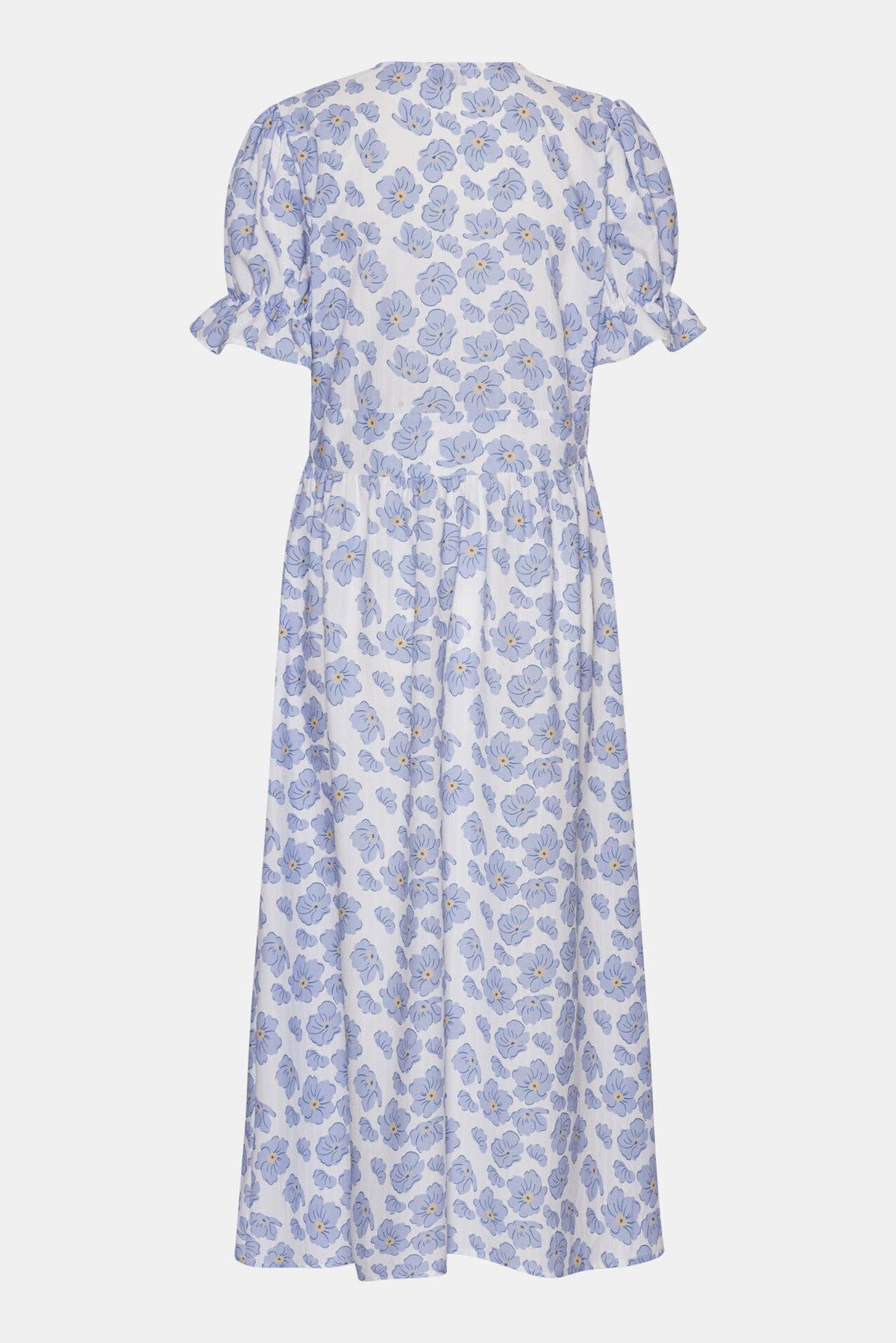 Lang kjole fra BYIC i hvid med blå blomster. Kjolen har v-udskæring, korte pufærmer og knaplukning foran. Den indsnævrede talje og flæsedetaljer giver kjolen en feminin form.