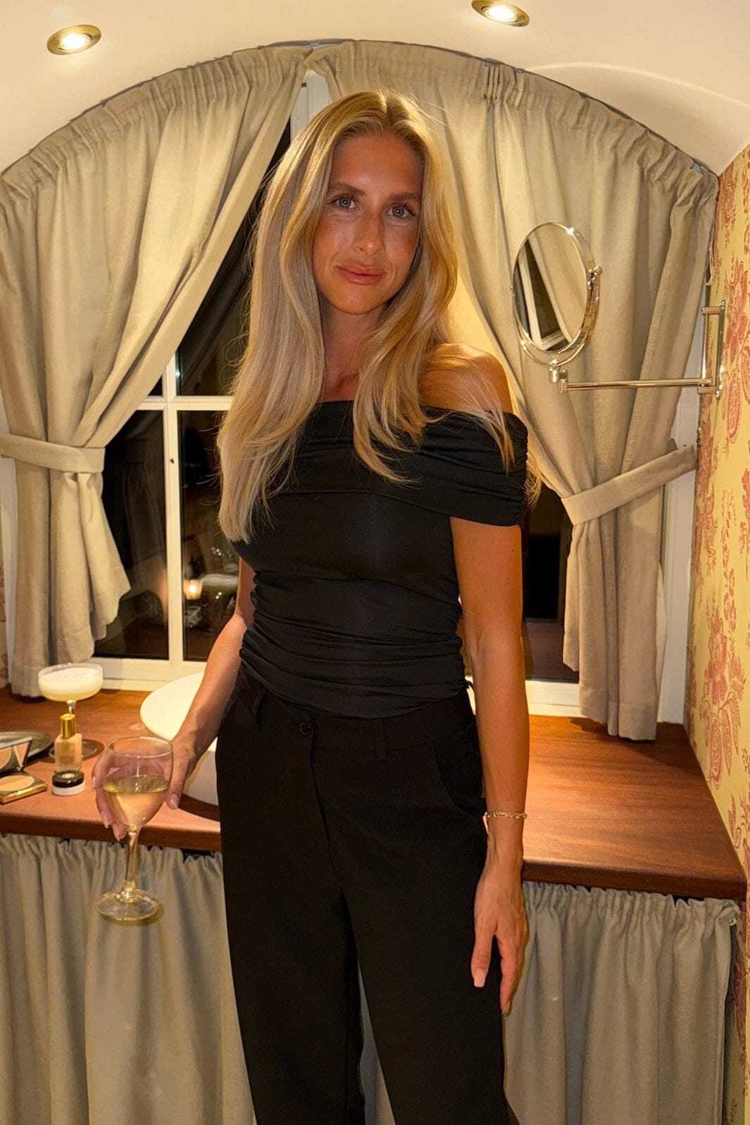 Sort top fra BYIC med off-shoulder-design. Toppen har rynkede detaljer langs siderne og på skulderpartiet. Den tætsiddende model er lavet i strækbart stof.
