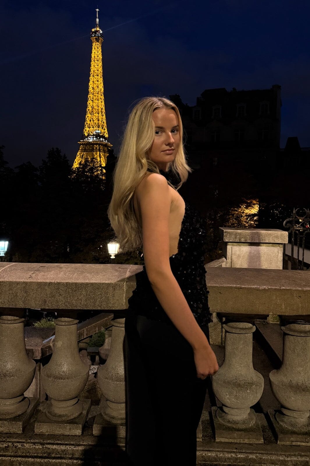 Sort paillettop fra BYIC med høj halsudskæring. Toppen har en åben ryg med knaplukning i nakken og et elastisk stof med foer.