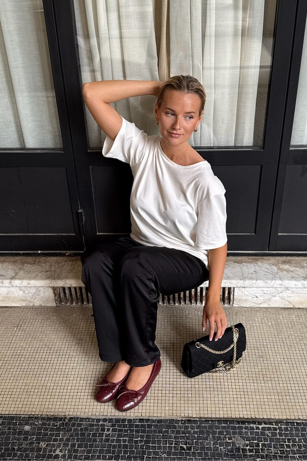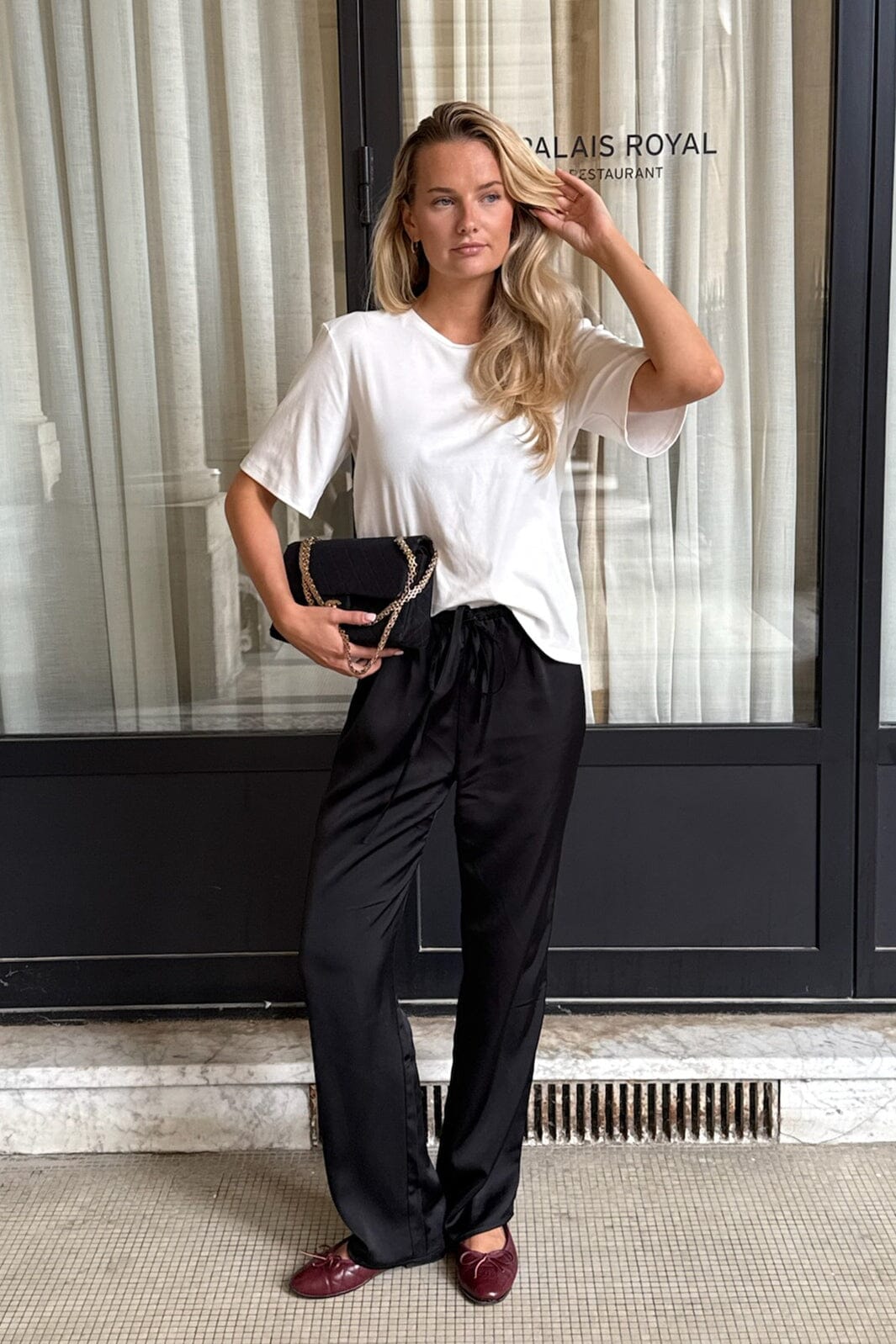 Sorte satinbukser fra BYIC med en skinnende overflade. Bukserne har en løs pasform og snøre i taljen, hvilket gør dem behagelige at have på.