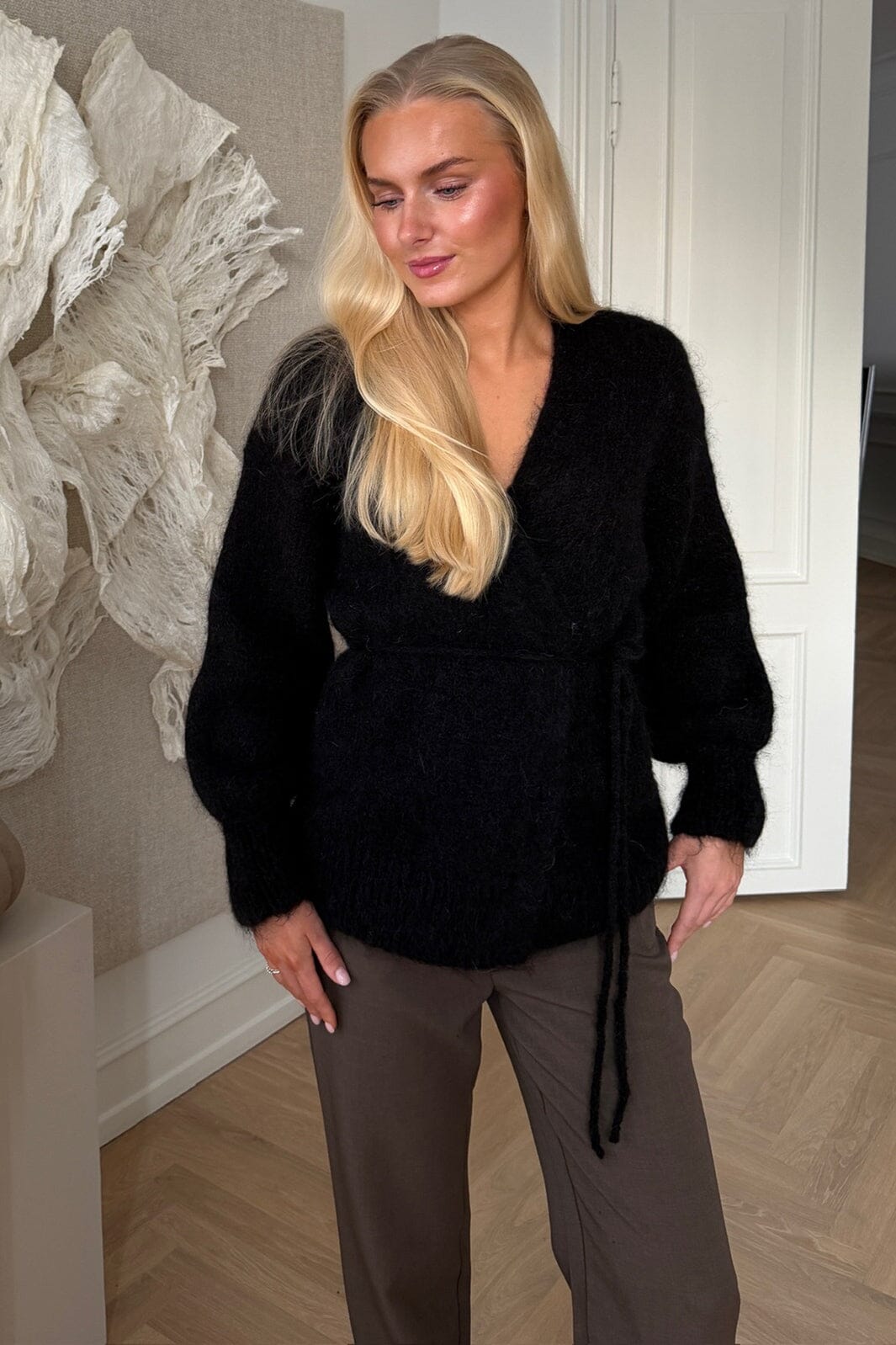 Sort wrap cardigan fra BYIC, lavet af en blanding med 40 % mohair og 10 % uld. Materialet giver en blød og varm følelse med en fluffy overflade.