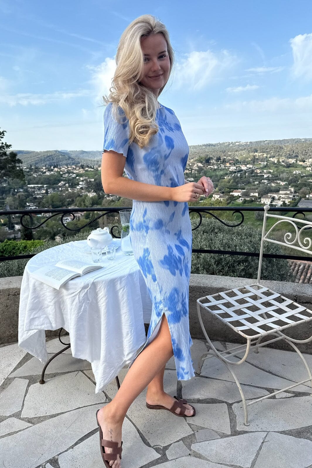 Kalvelang kjole fra BYIC i plisseret stof med lyseblå bundfarve og abstrakt blomstermønster. Kjolen har rund halsudskæring, korte ærmer og flæsedetaljer.