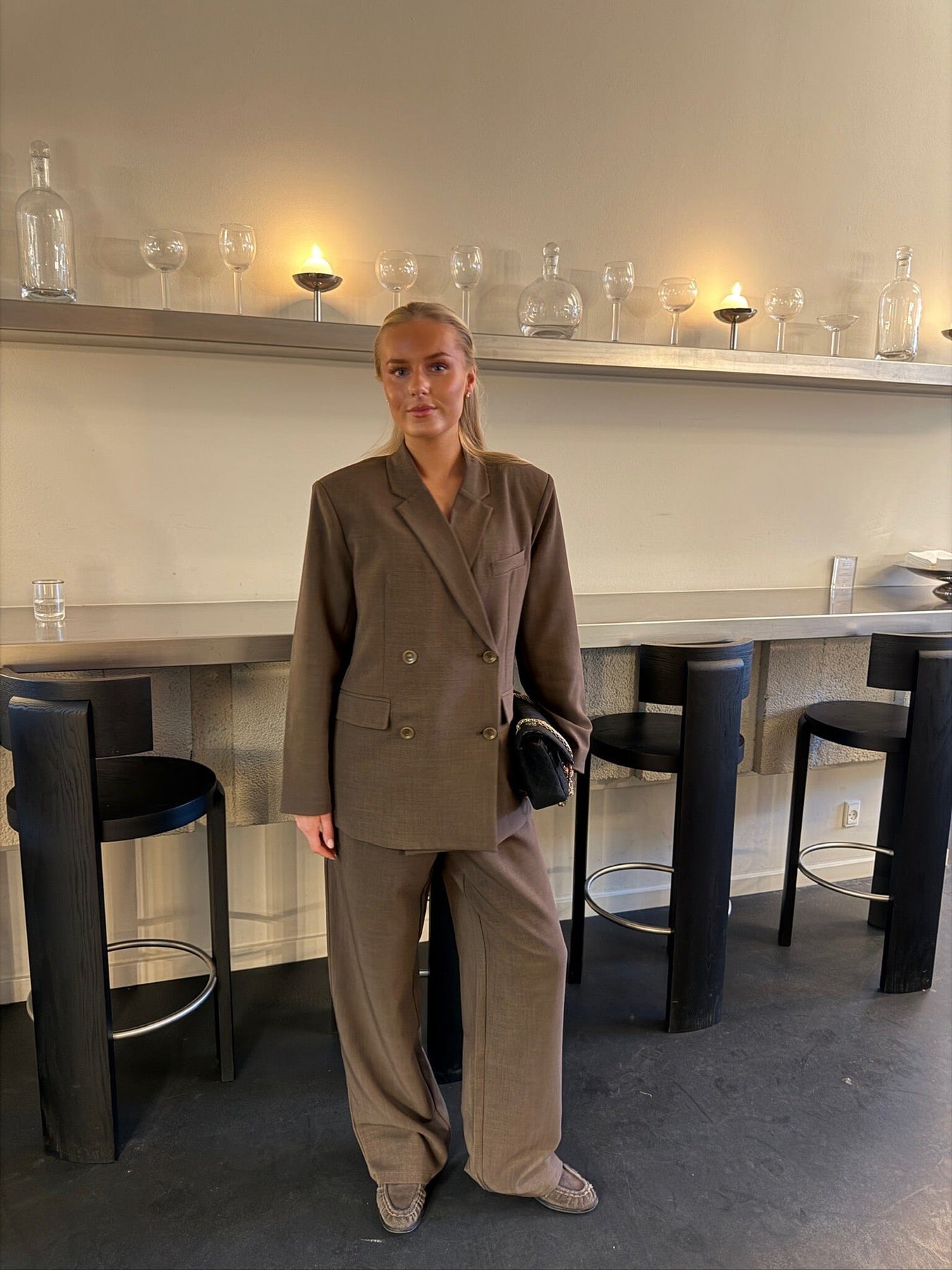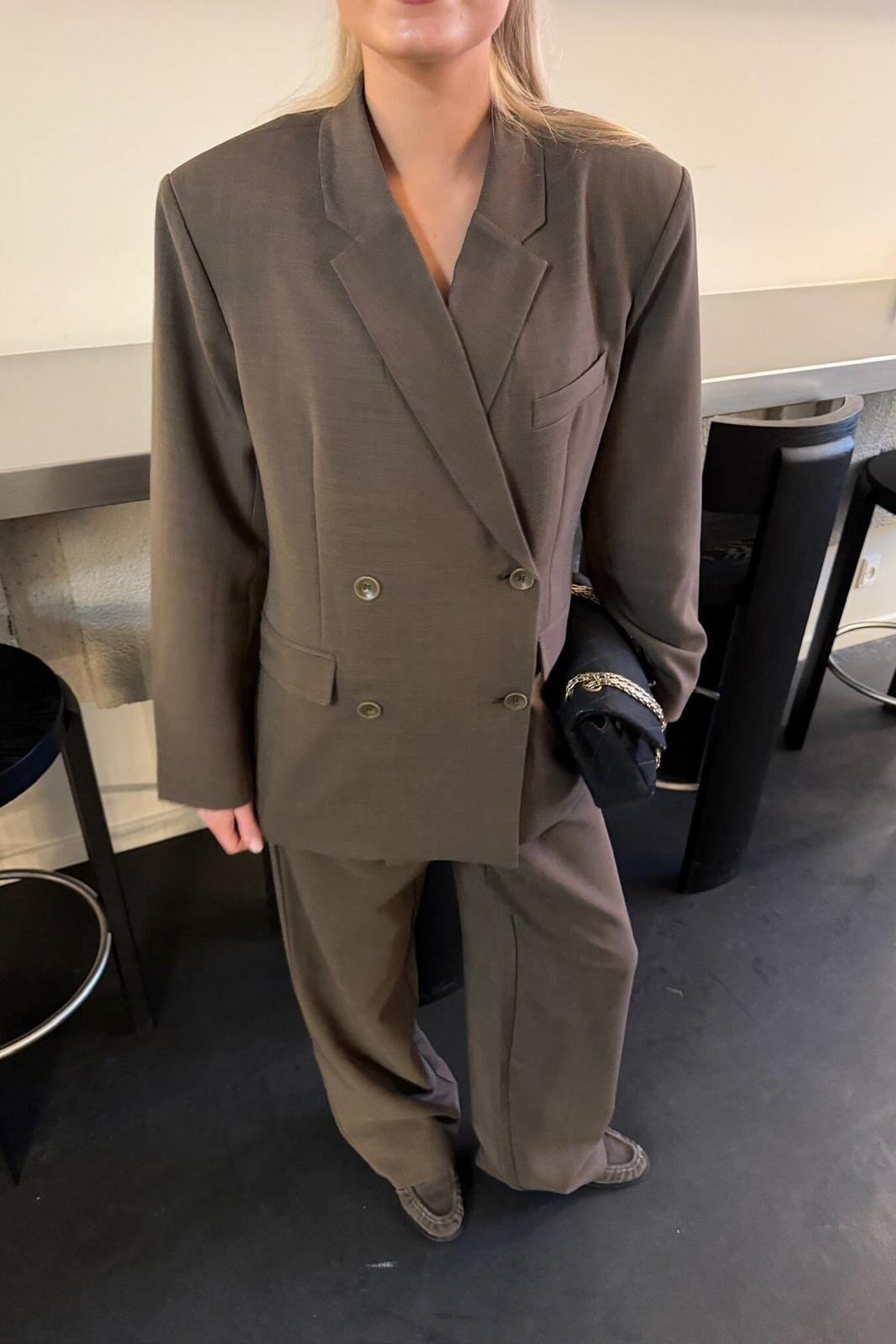 Dobbeltradet blazer fra BYIC i mørkebrun. Blazeren har en let oversized pasform og et klassisk dobbeltradet design med skjortekrave.