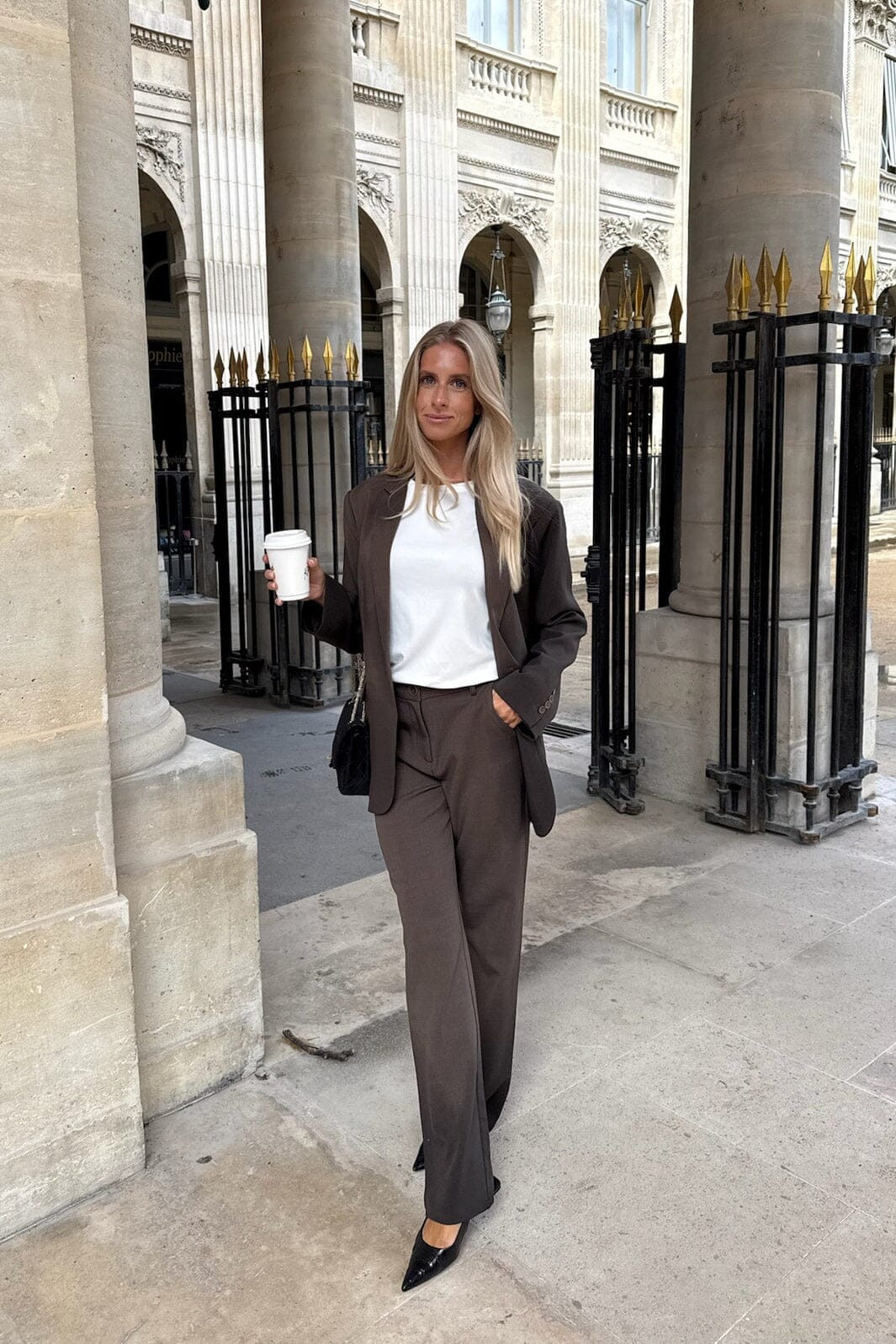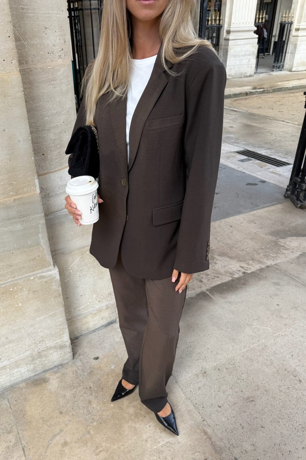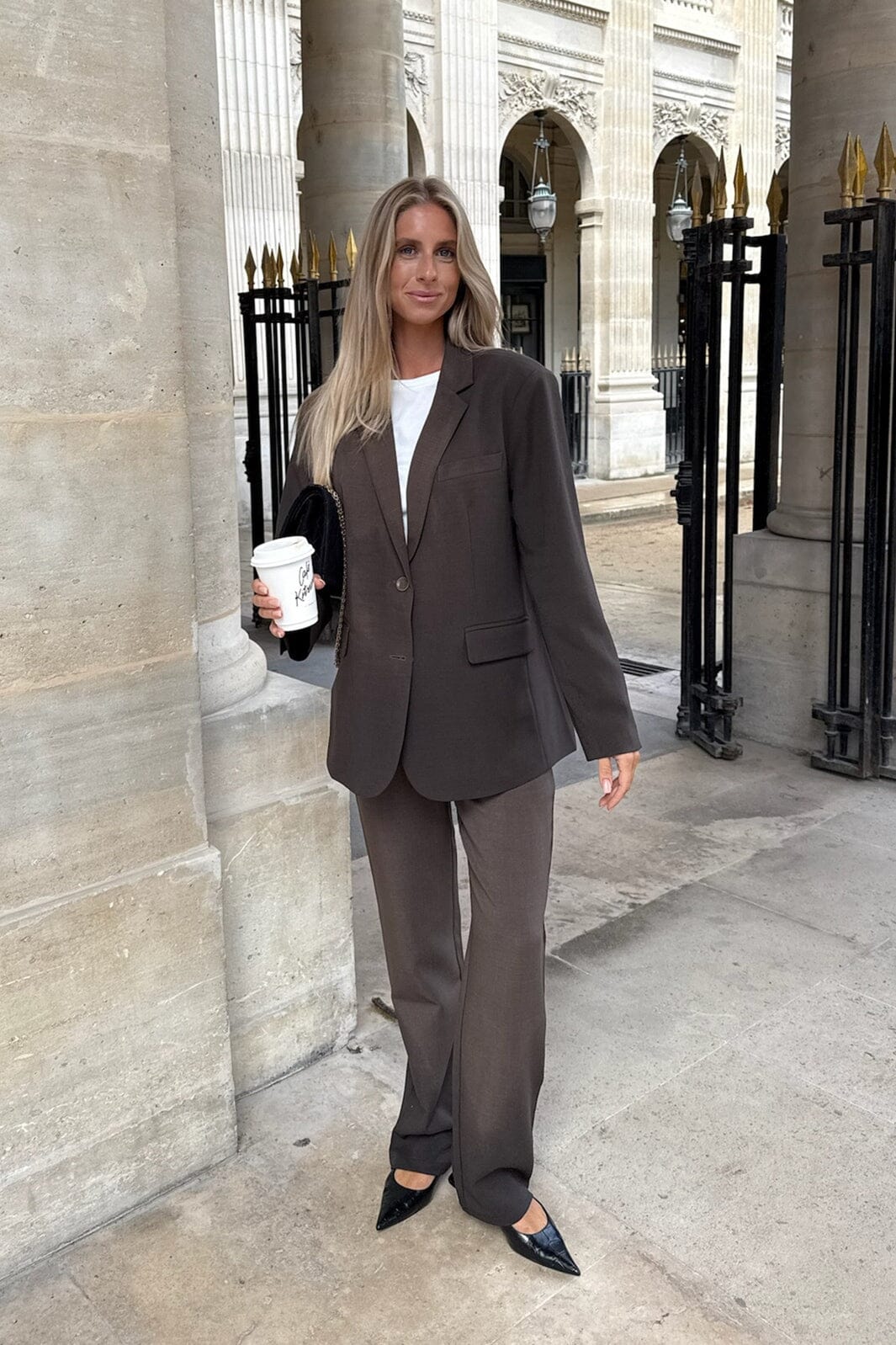Mørkebrune bukser fra BYIC med lige snit og høj talje. Bukserne har bæltestropper i taljen samt knap- og lynlåslukning foran.