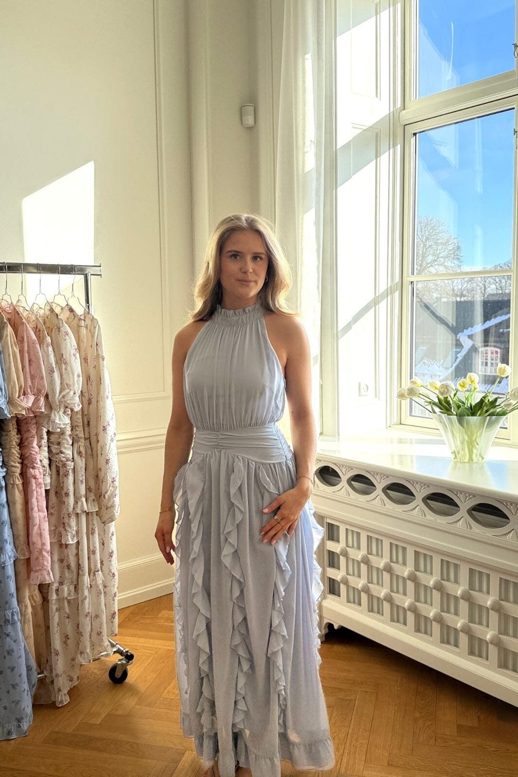 Lyseblå maxikjole fra BYIC, lavet af 100 % polyester. Kjolen har høj halsudskæring og er uden ærmer med en tætsiddende pasform.