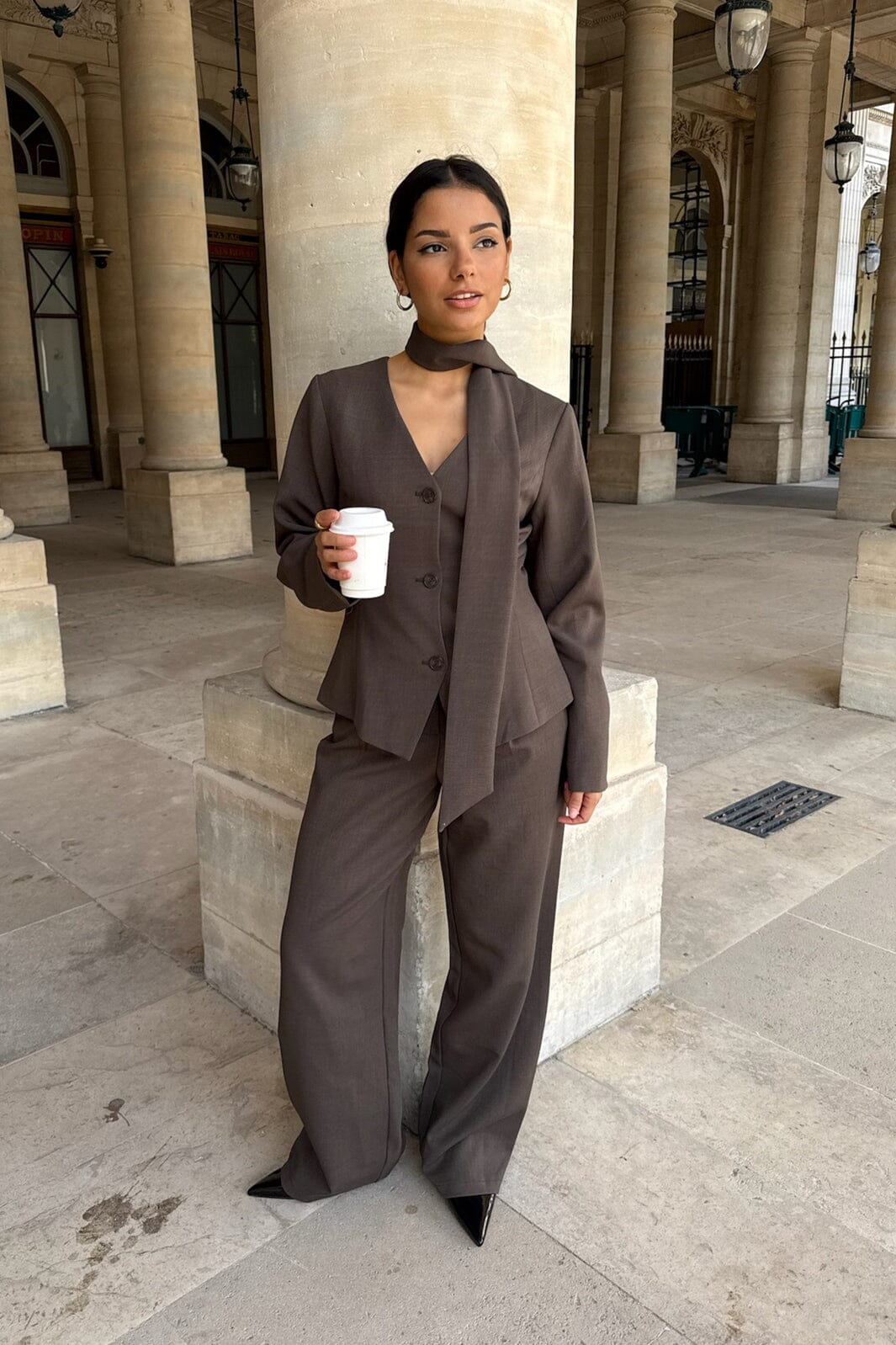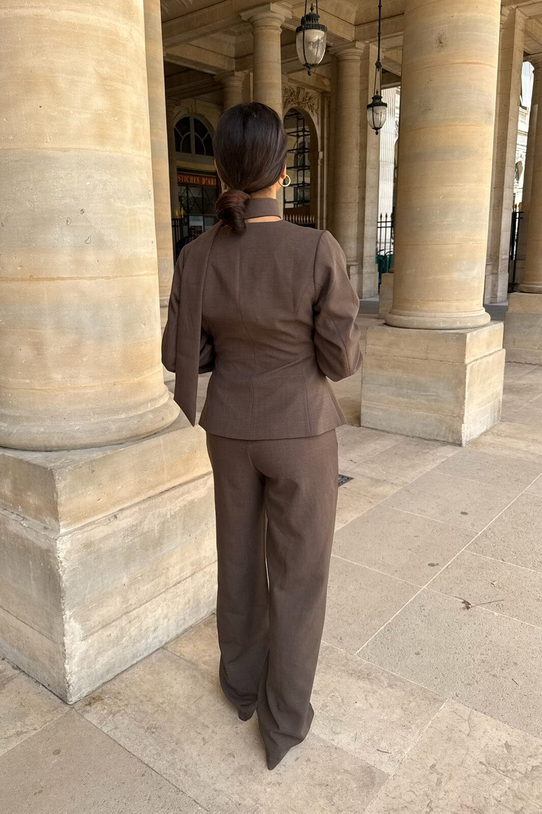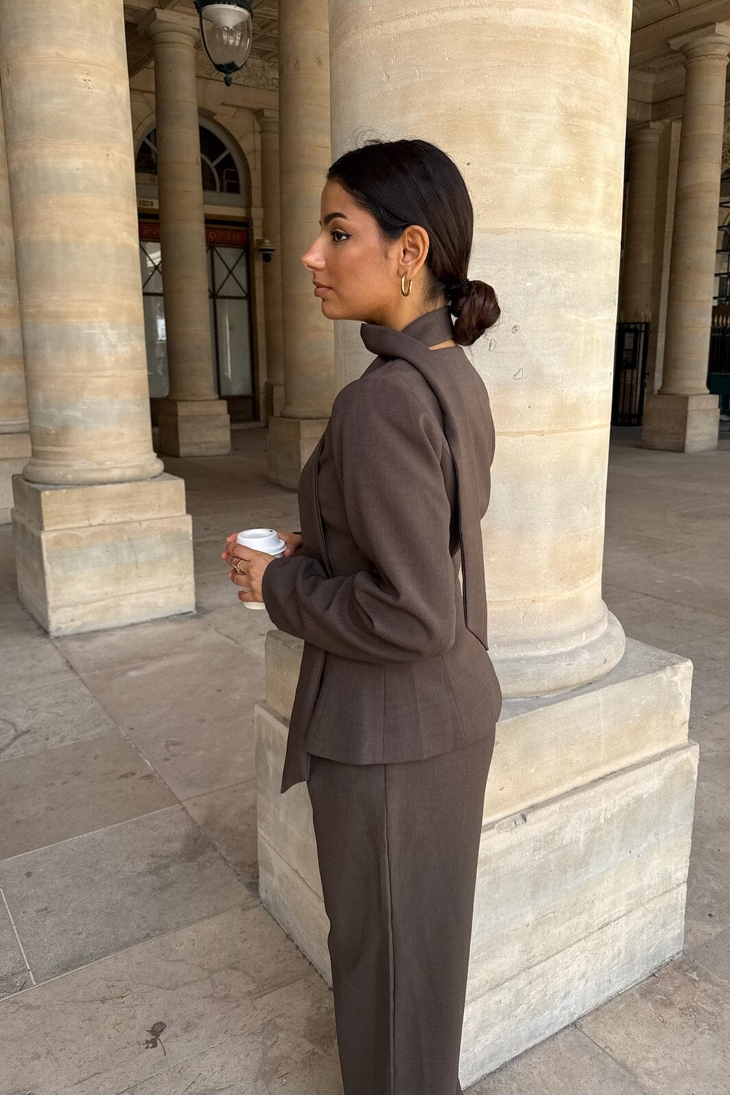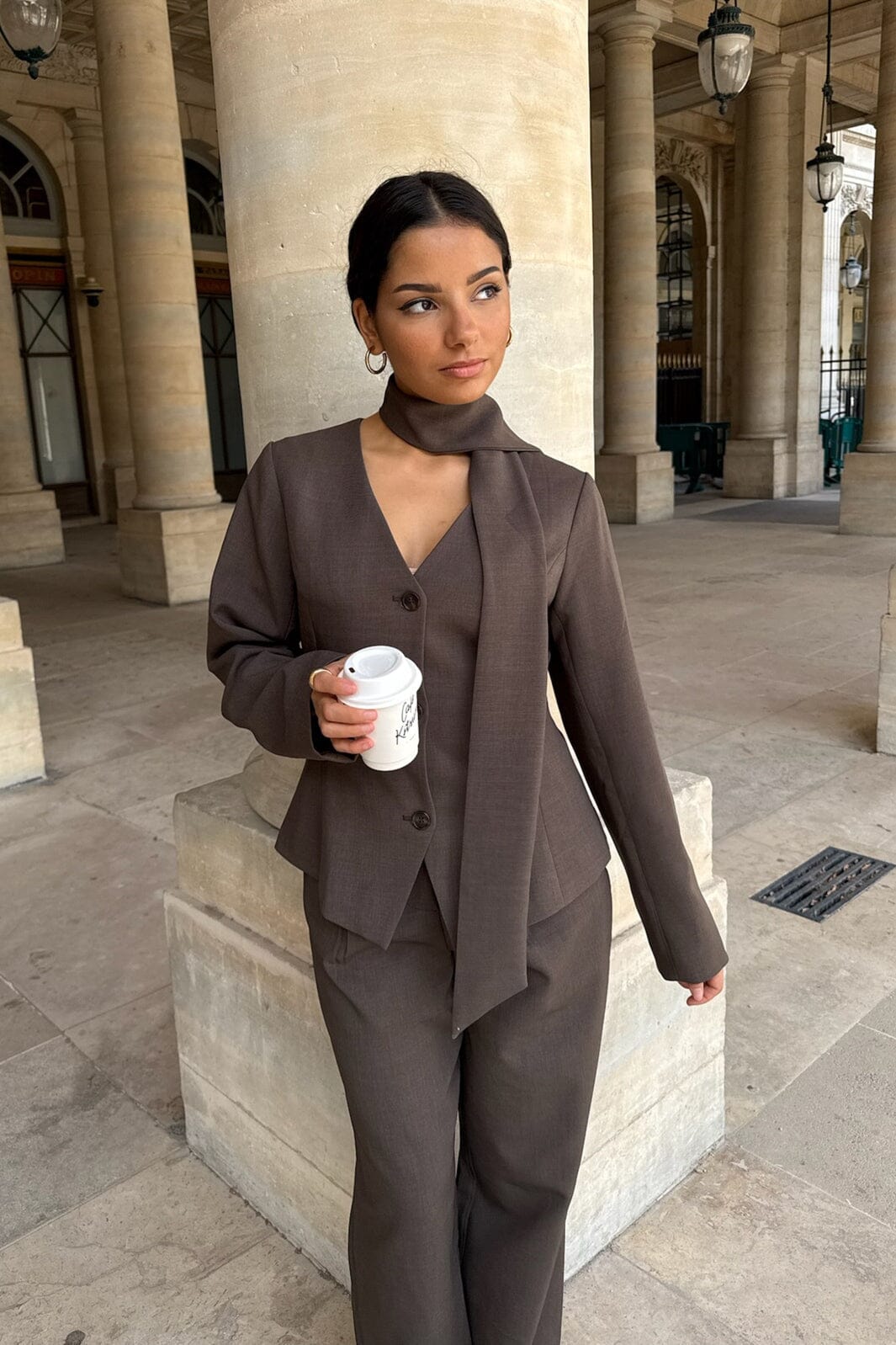 Mørkebrun blazer fra BYIC med V-udskæring og slim fit-pasform. Blazeren har et bindebælte, der kan bruges i taljen eller som halstørklæde, og lukkes med mørkebrune knapper foran.