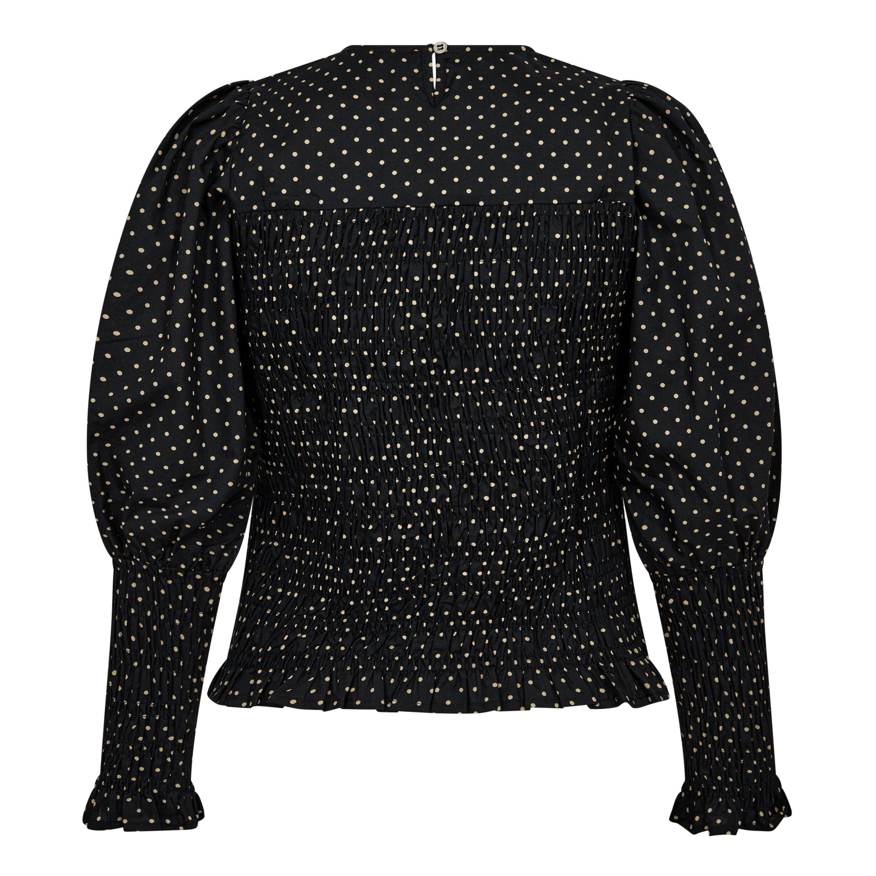 Sort bluse med gyldne prikker fra Co'Couture. Blusen har smockdetaljer ved taljen og ærmerne, der giver den form og volumen. Den runde hals og de lange ærmer skaber en klassisk silhuet.