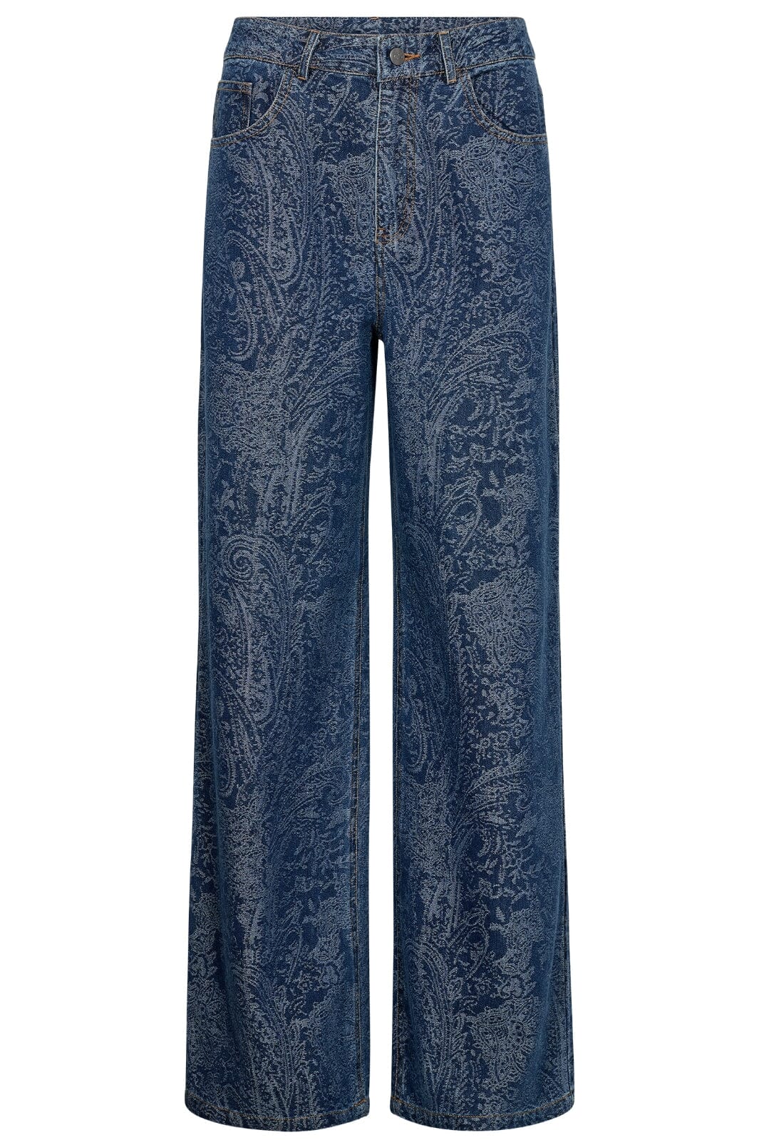 Denimbukser fra Co´Couture med paisley-mønster og brede ben. Bukserne har en blå denimfarve og ankellængde med lige ben, der giver plads til bevægelse.